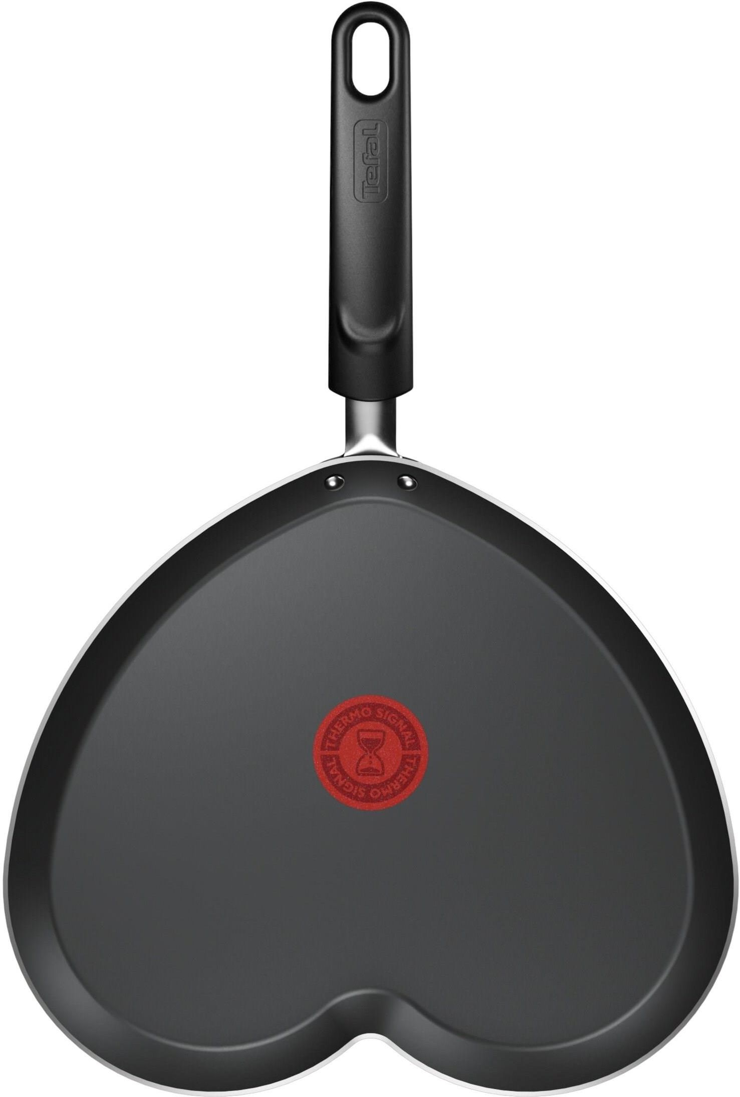 TEFAL do naleśników B0141002 25 cm Patelnia Naleśnikowa Tefal 25 cm w kształcie serca – idealna na Walentynki Zaskocz swoją drugą połówkę i przygotuj na Walentynki pyszne naleśniki w kształcie serca! Ta wyjątkowa patelnia sprawdzi się do przygotowania nie tylko klasycznych naleśników, ale też innych romantycznych przysmaków. Dzięki nieprzywierającej powłoce Titanium oraz inteligentnym rozwiązaniom, gotowanie stanie się prawdziwą przyjemnością, a efekt końcowy – niezapomniany. Powłoka Titanium- niezrównana trwałość i łatwość w utrzymaniu czystości Patelnia wyposażona jest w powłokę Titanium, która wyróżnia się odpornością na uszkodzenia i wysoką trwałością. Dzięki tej zaawansowanej technologii, powłoka jest odporna na zarysowania i ścieranie. Powłoka jest również nieprzywierająca, co sprawia, że zarówno przygotowywanie naleśników, jak i czyszczenie patelni staje się łatwiejsze. Thermo-Spot - inteligentny wskaźnik nagrzania Dzięki zastosowaniu wskaźnika Thermo-Spot, perfekcyjne rezultaty zawsze gwarantowane. Wskaźnik zmienia kolor w momencie, gdy patelnia osiągnie optymalną temperaturę, co pozwala uniknąć zarówno niedogotowanych, jak i przypalonych potraw. To rozwiązanie ułatwia gotowanie i poprawia efektywność - patelnia jest gotowa do użycia w odpowiednim momencie. Uniwersalność zastosowania Patelnia naleśnikowa jest kompatybilna z różnymi rodzajami kuchenek, dzięki czemu możesz jej używać na kuchenkach gazowych, elektrycznych, ceramicznych i halogenowych (z wyłączeniem indukcji). Niezależnie od rodzaju kuchenkę, patelnia spełni Twoje oczekiwania, gwarantując równomierne i szybkie rozprowadzenie ciepła. Gotowanie bez tłuszczu lub z minimalną ilością Dzięki powłoce nieprzywierającej, możesz przygotowywać potrawy z minimalną ilością tłuszczu, co sprzyja zdrowemu stylowi życia. Patelnia doskonale sprawdza się w przypadku osób, które chcą ograniczyć spożycie tłuszczu lub preferują zdrowe gotowanie. Odpowiednia warstwa powłoki pozwala na równomierne rozprowadzenie ciepła, co przekłada się na doskonałe efekty smażenia - bez nadmiernego tłuszczu, a za to z pełnym smakiem.