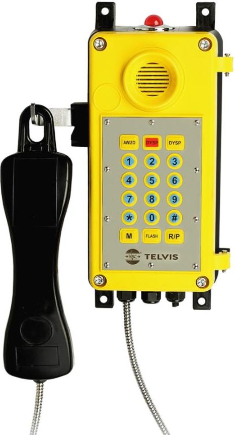 Telos TPN-S Aparat telefoniczny przemysłowyWersja z sygnalizatorem optycznym. Telefon przemysłowy typu TPN przeznaczony jest do eksploatacji w trudnych warunkach przemysłowych nie zagrożonych wybuchem, w tym górniczych (duża wilgotność, hałas, wysokie zapylenie). Dzięki obudowie odpornej na działanie warunków atmosferycznych oraz głośnemu sygnałowi wywołania, telefony przemysłowe TPN mogą być stosowane między innymi w: zakładach produkcyjnych halach fabrycznych stoczniach warsztatach samochodowych magazynach placach budowy browarach Współpraca Z wyposażeniami abonenckimi analogowymi central telefonicznych dowolnego typu. Zasilanie Z wyposażeń abonenckich analogowych central telefonicznych. Biegunowość linii abonenckiej dowolna Rezystancja dla prądu stałego max. 600 Ω Impedancja wejściowa 600 Ω Współczynnik tłumienności efektu lokalnego min. 13 dB Poziom głośności sygnału wywołania z odl. 1 m min. 90 dB Wybieranie numerów PM / DTMF Pamięci numerów powtarzanie ostatniego numeru – do 32 cyfr pamięć z dostępem bezpośrednim – 3 x 16 cyfr pamięć z dostępem pośrednim – 10×16 cyfr Sygnał optyczny przywołania widoczny z dużej odległości Stopień ochrony obudowy IP65 Gabaryty obudowy 275x140x90 mm Masa ok. 2,5 kg Zakres temperatur pracy od -40 do +40 ° C
