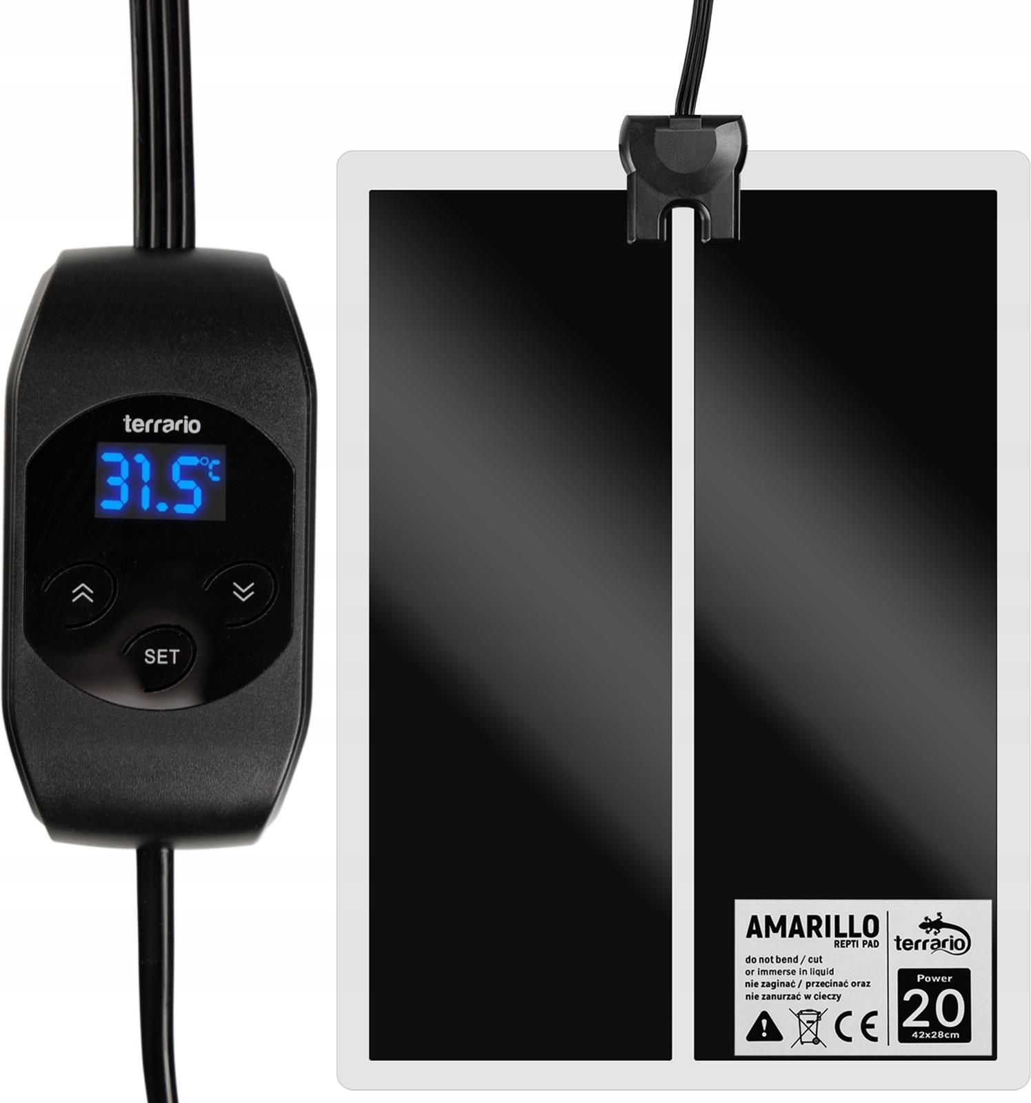 Terrario Amarillo 20W - mata grzewcza z termostatem LCD Mata grzewcza terrarystyczna z termostatem elektronicznym to doskonałe rozwiązanie do podniesienia i utrzymywania stałej temperatury w każdym terrarium. Kontroler LCD z termostatem umożliwi Ci precyzyjne zaprogramowanie temperatury z dokładnością do 0,5st.C. Co więcej kontroler posiada wbudowaną pamięć. Maksymalna temperatura maty grzewczej to aż 50st.C Mata Grzewcza Terrario Amarillo: Prosta, inteligentna i efektywna. Zaprogramuj żądaną temperaturę maty grzewczej i nie martw się więcej temperaturą w terrarium, nawet w przypadku braku prądu❗️ Zalety w skrócie: ➡️ zakres programowania i nagrzewania się: od 0st.C do 50st.C (mata to nie jest urządzenie chłodzące. Jeśli masz w pokoju 22st.C i zaprogramujesz matę na 18st.C to nie schłodzi Ci ona terrarium do 18st.C.) ➡️ wyświetla dane podczas programowania, a potem wyświetla aktualną temperaturę maty grzewczej ➡️wbudowana pamięć : zapamięta ustaloną przez Ciebie temperaturę, nawet jeśli przez jakiś czas nie będzie prądu ➡️ do każdegoterrarium tropikalnego i pustynnego , a nawet do roślinek dla kotów i piesków Materiały najlepszej klasy, łatwość w programowaniu, termostat elektroniczny wysoka wydajność cieplna - to więcej niż dotychczas oczekiwało się od mat grzewczych. ✅ Wysoka Jakość Wykonania: Wybierz matę grzewczą Terrario Amarillo dla swojego terrarium, aby zapewnić najwyższą jakość i niezawodność. Wykonana z trwałych materiałów, zapewnia długotrwałe użytkowanie. ✅ Wbudowany Termostat Elektroniczny: Ta nowoczesna mata grzewcza posiada wbudowany termostat elektroniczny, umożliwiający precyzyjne ustawienie i utrzymanie wymaganej temperatury, co jest kluczowe dla zdrowia i dobrego samopoczucia Twoich roślin i zwierząt terrariowych. ✅ Cyfrowy Wyświetlacz Temperatury: Wyposażona w łatwy w odczycie cyfrowy wyświetlacz, mata Terrario Amarillo pozwala na bieżąco monitorować temperaturę maty grzewczej, gwarantując idealne warunki w terrarium. ✅ Funkcja Zapamiętywania Ustawień: Ta inteligentna mata grzewcza zapamiętuje Twoje ustawienia, dzięki czemu nie musisz każdorazowo ponownie ustawiać temperatury, zapewniając wygodę i spójność warunków dla Twoich hodowli. ✅ Uniwersalność Zastosowania: Idealna dla różnorodnych roślin i zwierząt terrariowych, od gadów po tropikalne rośliny, mata Amarillo jest wszechstronnym rozwiązaniem dla każdego miłośnika terrarium. Ciepełkiem nie pogardzi również kot czy pies. Pamiętaj jednak, aby zabezpieczyć matę przez zębami psa i pazurami kota np: mięciutkim kocykiem. ✅ Bezpieczeństwo i Łatwość Użycia: Zaprojektowana z myślą o bezpieczeństwie użytkowania, mata grzewcza Terrario Amarillo eliminuje ryzyko przegrzania, nie dopuści do tego termostat odpowiednio regulując moc maty. Jest także łatwa w instalacji i obsłudze, co sprawia, że jest idealna dla zarówno początkujących, jak i zaawansowanych użytkowników terrariów. ⭐️ Niezrównana efektywność grzania! ⭐️ Mata grzewcza posiada ultra wysoką wydajność, nagrzewając się do maksymalnie 50st.C. Oczywiście jeśli tylko tyle chcesz i taką temperaturę zaprogramujesz. Zakres programowania jest od 0st.C do 50st.C z dokładnością do 0.5st.C. UWAGA. Mata to nie jest urządzenie chłodzące. Jeśli masz w pomieszczeniu np. 22st.C i zaprogramujesz matę np. na 18st.C to mata grzewcza nie obniży Ci temperatury do 18st.C. Dane techniczne: ➡️ moc: 20W ➡️ zakres grzania i regulacji termostatu: 0st.C do 50st.C ➡️ dokładność programowania i odczytu temperatury: 0,5st.C ➡️ wymiary maty: 42x28cm ➡️ długość przewodu grzewczego: 2m (termostat z kontrolerem znajduje się dokładnie w połowie przewodu)