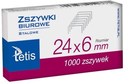 ZSZYWKI MARKI TETIS: - Wytrzymałe zszywki Tetis. - Rozmiar: 24x6 mm. - Ilość sztuk w opakowaniu: 1000. - Materiał: stal nierdzewna. Marka Tetis to spójna propozycja akcesoriów przeznaczonych do zastosowań biurowych. Jest częścią szerokiej oferty biznesowej, opartej na produktach o wysokich walorach użytkowych, charakteryzujących się klasycznym wzornictwem oraz dobrą jakością.