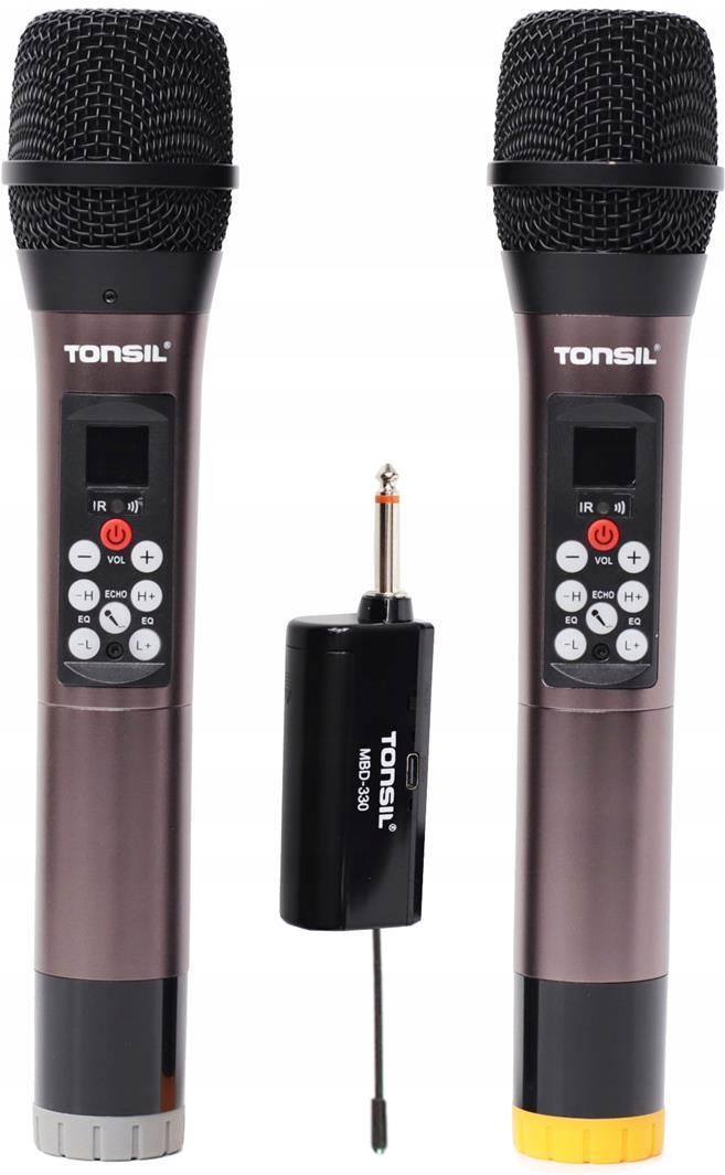 Tonsil MBD 330 - System bezprzewodowy mikrofonów Wysokiej klasy zestaw bezprzewodowego mikrofonu dynamicznego z odbiornikiem dedykowany do profesjonalnego i amatorskiego użytku. Stylowy, ergonomiczny i komfortowy znajdzie swoje zastosowanie w wielu miejscach Idealny do wokalu, wystąpień na żywo, karaoke czy konferansjerki Mikrofony zasilane bateriami typu AA (2 szt na mikrofon) Odbiornik zasilany akumulatorem, który ładujemy poprzez kabelek dołączony do zestawu Duży zasięg aż 30-50 metrów Nasz system gwarantuje niezawodność oraz transmisję najwyższej jakości w każdej sytuacji scenicznej. Prosty w obsłudze i niezawodny zapewni Ci spokój podczas pracy. Mikrofon jest zabezpieczony metalową siatką co gwarantuje bardzo długą jego żywotność. Wzmocniona obudowa odbiornika sprawdza się nawet w trudnych warunkach i pozwala na długoletnią pracę Możliwość zmian efektów audio VOL ECHO TREBLE BASS Specyfikacja Producent: Tonsil Model: MBD 330 Zakres częstotliwości: UHF: 500~580MHz Tryb modulacji: FM Zakres dynamiczny >100dB AUDIO OUT: 0-300mv Pasmo przenoszenia: 40hz-15KHz Zasięg: 30-50m Napięcie odbiornika: 3.7V/1200mA Napięcie transmitera: AA*2/1.5V*2 Czas pracy: 6-8 H W zestawie 2 x Mikrofon 1 x Odbiornik 1 x Akumulator 4 x Bateria AA 2 x Pianka na mikrofon 1 x Kabelek do ładowania 1 x Przejściówka jack 2 x Gumowe zabezpieczenie
