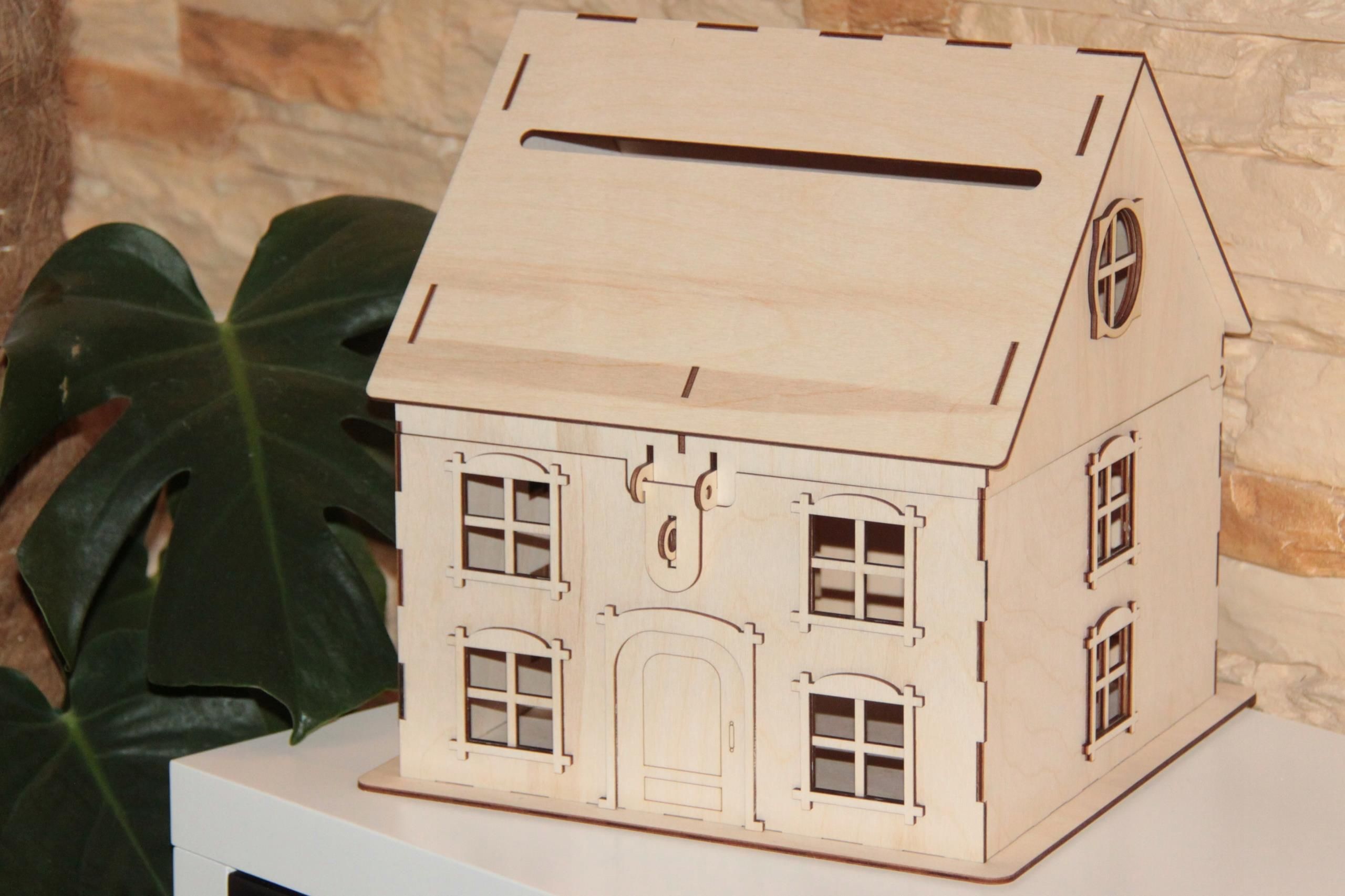 Nowoczesny domek skarbonka Nowoczesny domek skarbonka Materiał: sklejka brzozowa 3 mm Wykonanie: cięcie laserem Wymiar: 30 x 30 x 30 cm Kolor: naturalne drewno Domek skarbonka pamiątkowa przeznaczona do przechowywania życzeń ślubnych lub kopert z pieniędzmi z tego wyjątkowego dnia. Ten śliczny …