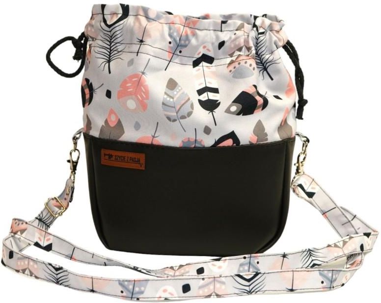 Mała Torebka Sakiewka z Motywem Piór – Subtelny Styl na Co Dzień Mała Torebka Sakiewka z Piórami to wyjątkowy dodatek, który zachwyca lekkością, funkcjonalnością i kobiecym wzornictwem. Jej kompaktowy, zaokrąglony kształt idealnie sprawdzi się na codzienne wyjścia – do pracy, na zakupy czy spotkanie z przyjaciółmi. Dolna część torebki wykonana jest z gładkiej, czarnej ekoskóry, która nadaje jej nowoczesny wygląd i zapewnia trwałość. Górna sekcja z lekkiej tkaniny poliestrowej ozdobiona jest delikatnym wzorem piórek w odcieniach różu, szarości i czerni, co tworzy subtelny i artystyczny efekt. Model zamykany jest na praktyczny sznurek, a regulowany pasek wykonany z tej samej wzorzystej tkaniny umożliwia dopasowanie długości do preferowanego sposobu noszenia – przez ramię lub na ukos. Dzięki temu torebka doskonale sprawdzi się w każdej sytuacji. Wysokość: 27 cm (+/- 1 cm) Głębokość: 7 cm (+/- 1 cm) Długość paska: regulowana, 78–146 cm Wielkość: Mała (nie mieści formatu A4) Materiał: Poliester i ekoskóra Wzór: Stylizowane pióra Zapięcie: Sznurek Kieszenie: Brak kieszeni wewnętrznych i zewnętrznych Okucia: Srebrne Wykonanie: Rękodzieło Postaw na lekkość i oryginalność. Ta mała torebka sakiewka to doskonały wybór dla kobiet, które cenią sobie praktyczność, wyjątkowy styl i ręczne wykonanie. Sprawdzi się zarówno w codziennym użytkowaniu, jak i jako uzupełnienie wyjątkowej stylizacji.