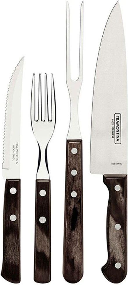 TRAMONTINA - sztućce z tradycją "Made in Brazil" Tramontina, to właściwy adres dla wszystkich miłośników wysokiej jakości sztućców i akcesoriów do grillowania. Już od 1911 roku, brazylijski ekspert specjalizuje się jako producent trwałych noży, dzięki czemu każde ostrze to ponad stuletnie doświadczenie i zaangażowanie. Dzięki przyjemnemu w dotyku i atrakcyjnemu wzornictwu noże Tramontina, sztućce do steków i inne przybory kuchenne są nie tylko funkcjonalne, ale również stanowią niezwykle stylowy dodatek do przysmaków z grilla. Przekonaj się o wysokiej jakości naszych wytrzymałych i atrakcyjnie zaprojektowanych produktów i przeglądaj naszą szeroką gamę sztućców, przyborów kuchennych i akcesoriów do grillowania. TRAMONTINA - ZESTAW DO BARBECUE POLYWOOD 14 elementów 29899211 Tramontina wykorzystuje najbardziej zaawansowane technologie do produkcji drewnianych uchwytów z Polywood'u do sztućców i innych przyborów kuchennych. Drewniane rączki mają znacznie wydłużoną żywotność i wyglądają świetnie nawet po latach. Są to jedyne drewniane sztućce, które mogą być bezpiecznie myte w zmywarce. Sztućce z serii Polywood to nowoczesny design połączony z praktycznością. Specjalna obróbka drewnianych uchwytów sprawia, że sztućce z tej linii są odporne na uderzenia, a także na wysokie temperatury. Swoje zastosowanie znajdują w życiu codziennym, jak również przy każdej specjalnej okazji. Produkty można myć w zmywarce. Dzięki procesowi hartowania ostrze noży Polywood zachowują ostrość przez długi czas. Noże posiadają odporność na wysoką temperaturę oraz długotrwały połysk. Drewno utwardzone, odporne na uderzenia. NADAJE SIĘ DO ZMYWARKI OSTRZE ZE STALI NIERDZEWNEJ 5 LAT GWARANCJI PRODUCENTA W zestawie 6 x 21100495 - nóż do steków 5" (ostrze 12,5cm) 6 x 21102490 - widelec stołowy 1 x 21131098 - nóż do mięsa 8" (ostrze 20cm) 1 x 21146090 - widelec do mięsa Wykonanie Ostrze wykonane jest ze stali nierdzewnej AISI 420, która odpowiada stali DIN 1.4028. Uchwyt Polywood wykonany z impregnowanego drewna połączony stalowymi nitami. Zasady bezpiecznego użytkowania Produkt przeznaczony do mycia w zmywarce. Dla zwiększonej wydajności produktu zaleca się bardzo staranne wysuszenie przed przystąpieniem do przechowywania, nawet jeśli noże były myte w zmywarce. Obchodzić się ostrożnie. Przechowywać z daleka od dzieci. Cechy Polywood Utwardzone drewno Odporne na uderzenia Można myć w zmywarce Odporne na wysokie temperatury 5 lat gwarancji Parametry produktu Produkt: Sztućce do barbecue (14 elementów) Długość ostrza: 5" (12,5cm) Materiał: Polywood Ostrze: stal nierdzewna Numer katalogowy: 29899211 (29899/211) Wymiary: 330x400x35 mm. Waga: 0,92 kg. EAN: 7891112200746 POLYWOOD - specjalnie przygotowane drewno powstaje poprzez impregnację kilku warstw drewna sosnowego żywicą, a następnie sprasowanie, pocięcie na kształt i polerowanie. Sprawdź jak powstają noże serii Polywood https://www.youtube.com/watch?v=OIoMDcRlc10 (prosimy skopiować powyższy link do przeglądarki) Zalecenia dotyczące użytkowania Przed pierwszym użyciem dokładnie umyj i osusz przedmioty. Ostrożnie obchodź się z ostrymi przedmiotami i trzymaj je poza zasięgiem dzieci. Dla dłuższej trwałości produktów, przed przechowywaniem należy wysuszyć po wyjęciu ze zmywarki. Proszę poddawać recyklingowi produkty i opakowania zgodnie z obowiązującymi wytycznymi dotyczącymi recyklingu.