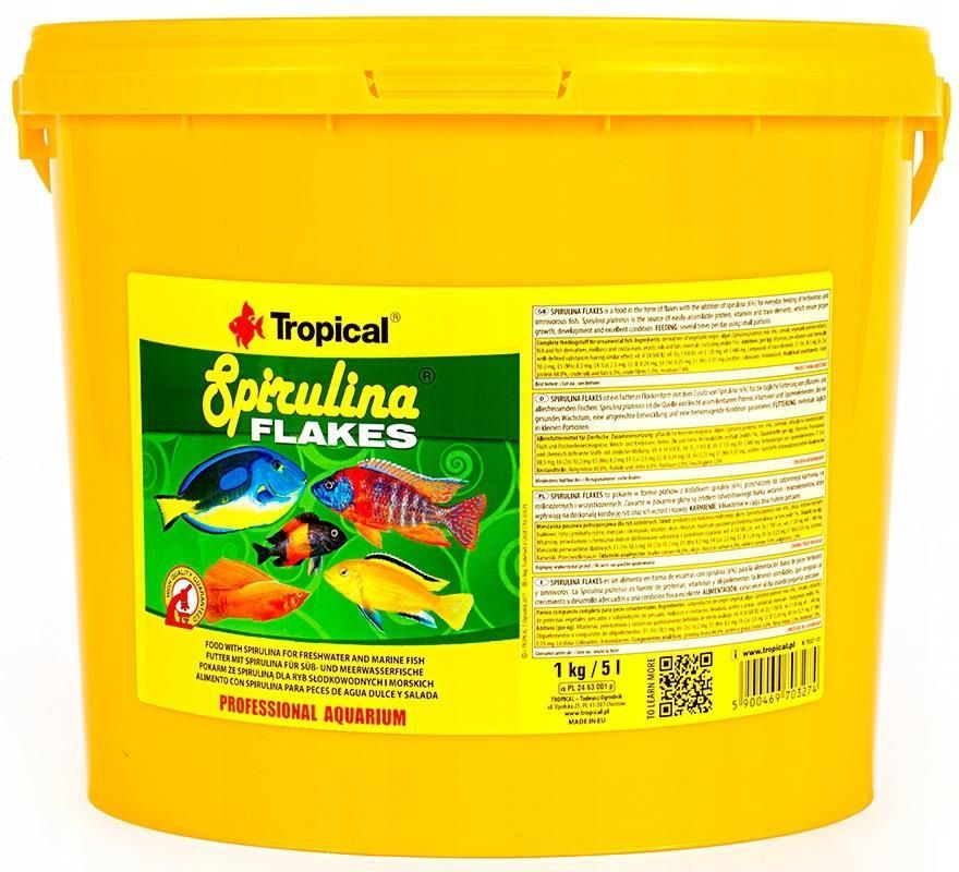 Tropical Spirulina Flakes [5l] - pokarm roślinny (płatki) Tropical tropical-70327 Spirulina Flakes to pokarm przeznaczony do codziennego karmienia ryb roślinożernych i wszystkożernych w akwariach słodkowodnych i morskich, w tym popularnych pyszczaków z jeziora Malawi, tęczanek, brzanek, gupików, …