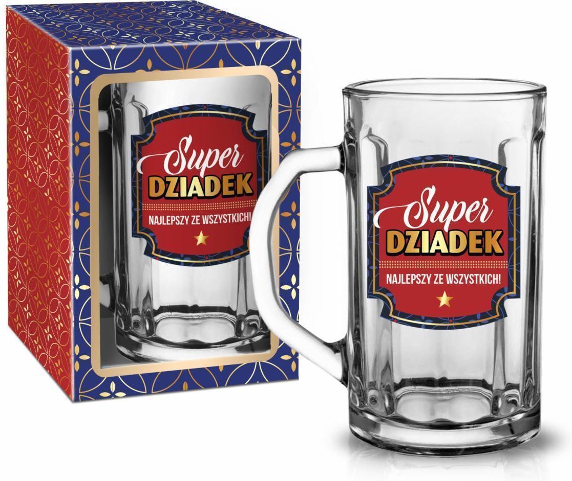 Szklany kufel z serii Nicol marki Creative Factory. Pojemność kufla 500 ml. Produktem, który spodoba się zwłaszcza miłośnikom nowoczesnego designu, jest kufel do napojów z napisem. Kufel ten został wykonany z grubego, przezroczystego szkła. Kufel z uchwytem oraz złoto-białym napisem "Super DZIADEK …