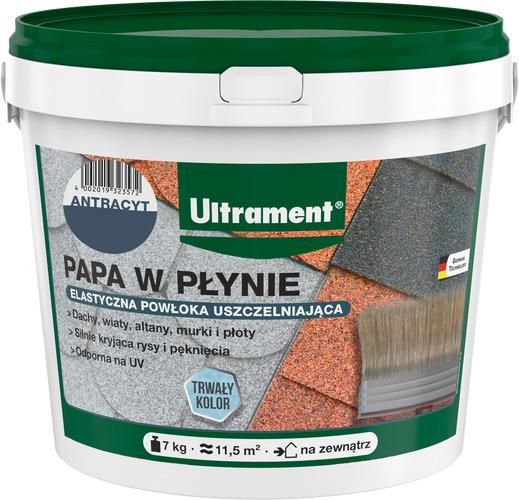 Papa w płynie Ultrament jest idealna do odnawiania powierzchni takich jak papa, gonty, opierzenia, dachówki, blacha trapezowa, eternit, drewno i inne elementy architektury ogrodowej (altany, wiaty, skrzynie na narzędzia). Dzięki doskonałej przyczepności do różnych materiałów, tworzy elastyczną i odporną na wodę oraz UV powłokę. Produkt jest szybkoschnący i łatwy w aplikacji. Przygotowanie podłoża, Podłoże powinno być suche, czyste, mocne i stabilne. Podłoża chłonne należy zagruntować akrylowym gruntem, natomiast powierzchnie niechłonne rozcieńczoną farbą (1:5). Obróbka : Przed użyciem produkt należy wymieszać. Farbę nakładać pędzlem, wałkiem lub natryskiem (dysza min. 3 mm, ciśnienie 5 bar). Nakładać co najmniej 2 warstwy, a dla uszczelnienia min. 1 mm grubości na gotowo. Czas schnięcia każdej warstwy to 2-3 godziny, pełne utwardzenie po 12-24 godzinach. Wskazówki : Prace należy wykonywać w temperaturze +10°C do +25°C. Chronić przed warunkami atmosferycznymi do pełnego utwardzenia. Informacje techniczne : Baza materiałowa: Dyspersja akrylowej. Kolory: Czarny, antracyt, brąz, szary. Pełne utwardzenie: 12-24 godziny, pH: 8,5. Temperatura obróbki: +10°C do +25°C. Przechowywanie : Produkt należy przechowywać w oryginalnym, zamkniętym opakowaniu w miejscu wolnym od mrozu przez 18 miesięcy.