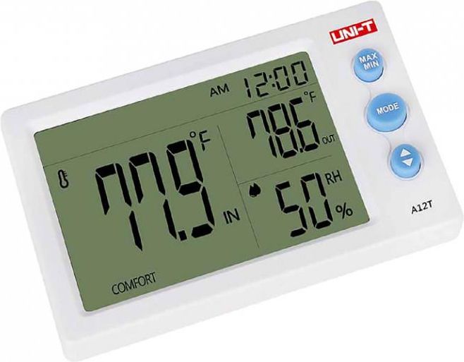 Stacja pogodowa Uni-T A12T UNI-T Stacja pogodowa Uni-T A12T Stacja pogodowa Uni-T A12T to wszechstronne urządzenie do monitorowania temperatury i wilgotności, które oferuje dokładne pomiary oraz dodatkowe funkcje użytkowe. Idealna do użytku domowego lub biurowego, stacja pogodowa łączy precyzyjność z łatwością obsługi. Dokładne pomiary temperatury i wilgotności Stacja pogodowa Uni-T A12T umożliwia pomiar temperatury w zakresie od -10°C do 50°C z dokładnością ±1°C i rozdzielczością 0,1°C. Wilgotność mierzy w zakresie od 0% do 99% RH, z dokładnością ±5% RH i rozdzielczością 1%. Dzięki tym parametrom, użytkownik uzyskuje precyzyjne informacje o aktualnych warunkach atmosferycznych. Funkcje dodatkowe dla pełnej funkcjonalności Uni-T A12T oferuje funkcję śledzenia wartości maksymalnych i minimalnych, co pozwala na monitorowanie ekstremalnych warunków. Wbudowany budzik i zegar, który obsługuje formaty 12- oraz 24-godzinny, zwiększają wygodę użytkowania. Zewnętrzny czujnik przewodowy pozwala na monitorowanie temperatury i wilgotności w różnych lokalizacjach, co daje większą elastyczność w zarządzaniu warunkami w różnych częściach domu czy biura. Praktyczna konstrukcja Stacja pogodowa Uni-T A12T charakteryzuje się częstotliwością próbkowania 10/s, co zapewnia szybkie i dokładne aktualizacje pomiarów. Urządzenie zasilane jest baterią 1,5 V (R03) i wyposażone w wyraźny wyświetlacz LCD o wymiarach 92,5 x 60 mm. Wymiary stacji to 130 x 22 x 78 mm, a jej waga to 110 g, co zapewnia kompaktowość i łatwość w umiejscowieniu. Do zestawu dołączona jest bateria oraz czujnik zewnętrzny, co umożliwia natychmiastowe rozpoczęcie użytkowania. POMIARY Temperatura • Zakres pomiaru: -10°C ~ 50°C • Dokładność pomiaru: ±1°C • Rozdzielczość: 0,1°C Wilgotność • Zakres pomiaru: 0~99% RH • Dokładność pomiaru: ±5% RH • Rozdzielczość: 1% DODATKOWE FUNKCJE Wartość MAX/MIN Budzik/zegar Czas w formacie 12/24-godzinnym Zewnętrzny czujnik przewodowy CECHY OGÓLNE Częstotliwość próbkowania: 10/s Zasilanie: bateria 1,5 V (R03) Wyświetlacz LCD: 92,5 x 60 mm Waga: 110 g Wymiary: 130 x 22 x 78mm Akcesoria: bateria, czujnik zewnętrzny Stacja pogodowa Uni-T A12T Stacja pogodowa Uni-T A12T to wszechstronne urządzenie do monitorowania temperatury i wilgotności, które oferuje dokładne pomiary oraz dodatkowe funkcje użytkowe. Idealna do użytku domowego lub biurowego, stacja pogodowa łączy precyzyjność z łatwością obsługi. Dokładne pomiary temperatury i wilgotności Stacja pogodowa Uni-T A12T umożliwia pomiar temperatury w zakresie od -10°C do 50°C z dokładnością ±1°C i rozdzielczością 0,1°C. Wilgotność mierzy w zakresie od 0% do 99% RH, z dokładnością ±5% RH i rozdzielczością 1%. Dzięki tym parametrom, użytkownik uzyskuje precyzyjne informacje o aktualnych warunkach atmosferycznych. Funkcje dodatkowe dla pełnej funkcjonalności Uni-T A12T oferuje funkcję śledzenia wartości maksymalnych i minimalnych, co pozwala na monitorowanie ekstremalnych warunków. Wbudowany budzik i zegar, który obsługuje formaty 12- oraz 24-godzinny, zwiększają wygodę użytkowania. Zewnętrzny czujnik przewodowy pozwala na monitorowanie temperatury i wilgotności w różnych lokalizacjach, co daje większą elastyczność w zarządzaniu warunkami w różnych częściach domu czy biura. Praktyczna konstrukcja Stacja pogodowa Uni-T A12T charakteryzuje się częstotliwością próbkowania 10/s, co zapewnia szybkie i dokładne aktualizacje pomiarów. Urządzenie zasilane jest baterią 1,5 V (R03) i wyposażone w wyraźny wyświetlacz LCD o wymiarach 92,5 x 60 mm. Wymiary stacji to 130 x 22 x 78 mm, a jej waga to 110 g, co zapewnia kompaktowość i łatwość w umiejscowieniu. Do zestawu dołączona jest bateria oraz czujnik zewnętrzny, co umożliwia natychmiastowe rozpoczęcie użytkowania.