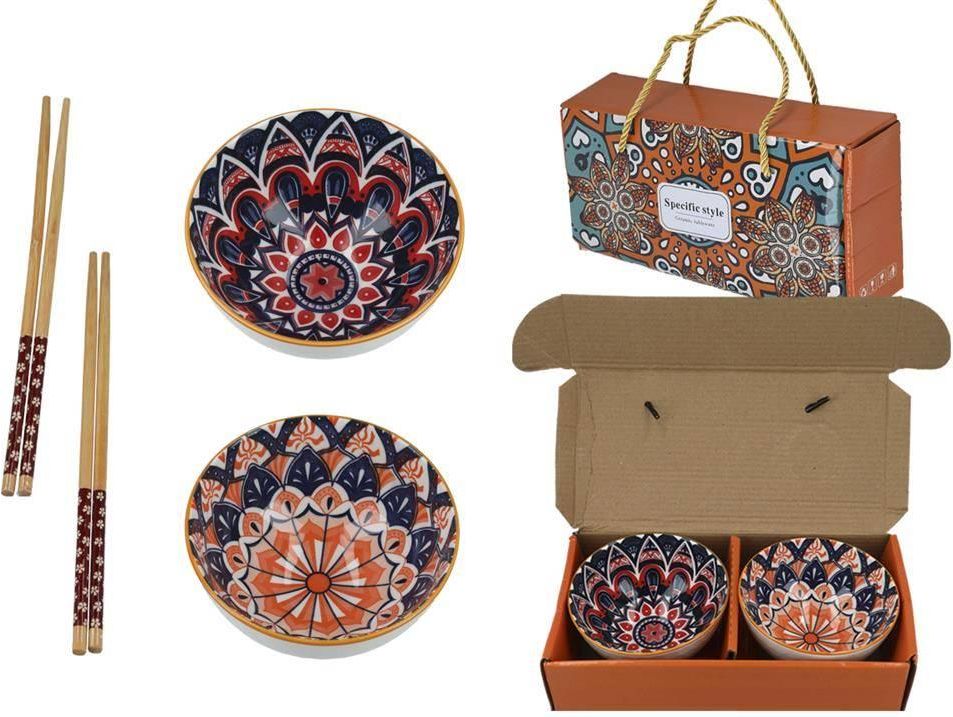 Komplet 2 miseczki pałeczki do sushi dla 2 osób orient (15549) Zorganizuj wieczór w klimacie kultury orientalnej – zapal kadzidełka i podaj swoim gościom sushi na specjalnym porcelanowym zestawie w stylu japońskim. Porcelanowy zestaw do sushi składający się z 4 elementów. Naczynia o kremowym odcieniu bieli zdobione są orientalnym wzorem oraz delikatnym tłoczeniem po zewnętrznej stronie. Zestaw dla 2 osób, który zawiera 2 komplety pałeczek oraz 2 miseczki o pojemności całkowitej około 260 ml (pojemność liczona po rant miseczki). Komplet wygodny w użytkowaniu i prosty w utrzymaniu czystości. Można go swobodnie myć w zmywarce oraz używać w kuchence mikrofalowej, co ułatwi codzienne użytkowanie i zaoszczędzi nasz cenny czas. Całość zapakowana w prezentowe pudełko to doskonały pomysł na niebanalny prezent urodzinowy dla miłośników dobrego japońskiego jedzenia i nie tylko. Wzór: 846-3217 Produkt: 2 x zestaw pałeczek 2 x miseczka 1 x prezentowe opakowanie Wymiary: miseczka: średnica 11,5 cm, h 6 cm, poj. około 260 ml długość pałeczek: 22,5cm wymiary pudełka: 25,5cm x 12,2 cm x h6,2 cm Materiał: porcelana Użytkowanie: dopuszczone do kontaktu z żywnością do zmywarki do mikrofali
