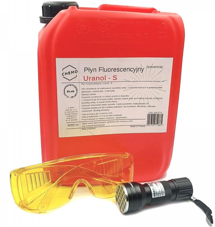 Uranol – S to płyn fluorescencyjny stosowany głównie do wykrywania wycieków instalacji wodnych, w postaci koncentratu. Pojemność: 5000 ml. Płyn oparty na bazie roztworu uraniny będącej najsilniejszym markerem fluorescencyjnym. Jest bezpieczny w użytkowaniu i biodegradowalny. Posiada szeroki zakres stosowania. Można go wykorzystywać do wykrywania wycieków w instalacjach chłodniczych pojazdów samochodowych i maszyn. Wykorzystywany jest także do kontroli szczelności w dużych instalacjach chłodniczych i przemysłowych. W domu znajduje zastosowanie do wykrywania nieszczelności instalacji centralnego ogrzewania. Zestaw zawiera lampę UV emitującą promieniowanie o optymalnej długości światła dla wykrywania markera. Zawiera również okulary ochronne UV. Wykrywanie nieszczelności polega na dolaniu do wody, w kontrolowanej instalacji, płynu Uranol-S. Należy przy tym zastosować rozcieńczenie 1 porcja płynu na 50 do 100 części wody roboczej w instalacji. Uruchomić przepływ cieczy w instalacji wodnej i utrzymywać ją w stanie roboczym do kilkunastu do kilkudziesięciu minut. Finalnie należy skontrolować wszelkie połączenia stosując do detekcji lampę lub inne źródło światła UV. Miejsca wycieków będą wyraźnie widziane w postaci zielono fluorescencyjnych wyraźnie świecących plam. Uranina wykazuje najwyższą emisję światła przy promieniowaniu 365 nm. Płyn Uranol – S może być stosowany także jako marker do dyskretnego znakowania przedmiotów. Wystarczy nanieść niewielką ilość rozcieńczonego roztworu na przedmiot. Sposób wykrywania takiego oznaczenia będzie możliwe jedynie w obecności światłą UV. Preparat bezpieczny dla instalacji stalowych, aluminiowych, kamienia, z tworzyw sztucznych. Biodegradowalny. Preparat dostarczany w pojemnikach HDPE, zabezpieczonych hologramem producenta.