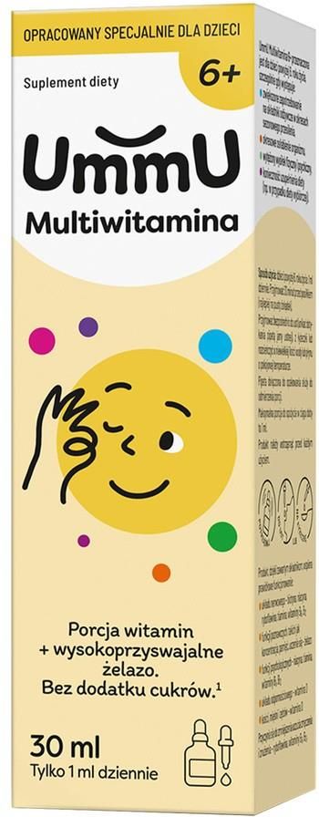 UmmU Multiwitamina, dla dzieci od 6 lat, krople, smak pomarańczowy, 30 ml UmmU Multiwitamina 6+ to suplement diety w formie kropli o pysznym pomarańczowym smaku, przeznaczony dla dzieci od 6. roku życia. Preparat zawiera zestaw witamin z grupy B, witaminę D oraz żelazo w innowacyjnej formie – mikronizowane i mikroenkapsułkowane żelazo, które nie barwi zębów, nie pozostawia metalicznego posmaku i jest łagodne dla żołądka. Jak działają składniki UmmU Multiwitamina 6+? Żelazo – pomaga w prawidłowej produkcji czerwonych krwinek i hemoglobiny oraz wspiera transport tlenu w organizmie. Witamina D – wspomaga prawidłowe funkcjonowanie układu odpornościowego, utrzymanie zdrowych kości, mięśni i zębów. Witaminy B6, B12, niacyna (B3), ryboflawina (B2), tiamina (B1), biotyna (B7) – wspierają prawidłowe funkcjonowanie układu nerwowego, a witaminy B6, B12, B3 i B7 wspierają prawidłowe funkcje psychologiczne. Witaminy z grupy B (B2, B,3 B6 i B12) oraz żelazo – przyczyniają się do zmniejszenia uczucia zmęczenia i znużenia. Zastosowanie Suplementacja diety w witaminy i minerały zawarte w produkcie dla dzieci od 6 roku życia. Zalecane spożycie Dzieci powyżej 6. roku życia: 1 ml w ciągu dnia, 30 minut przed posiłkiem. Przyjmować bezpośrednio do ust (unikać dotykania pipetą jamy ustnej), z łyżeczki lub rozcieńczyć w niewielkiej ilości wody lub płynu o pokojowej temperaturze. Do opakowania dołączona jest pipeta z podziałką co 1 ml, umożliwiająca precyzyjne odmierzenie porcji. Przed każdym użyciem produkt należy dokładnie wstrząsnąć. Składniki Woda; substancja zagęszczająca: ksylitol; żelazo [maltodekstryna, difosforan żelaza (III) (pirofosforan żelaza (III)), estry kwasów tłuszczowych i poliglicerolu, lecytyny (sojowe)]; amid kwasu nikotynowego; naturalny aromat pomarańczowy z innymi naturalnymi aromatami; substancja zagęszczająca: guma ksantanowa; cholekalcyferol; substancja konserwująca: sorbinian potasu; chlorowodorek pirydoksyny; chlorowodorek tiaminy; ryboflawiny 5'-fosforan sodowy; D-biotyna; metylokobalamina. 1 ml zawiera: żelazo 2,1 mg (15%)*, niacyna (witamina B3) 4 mg (25%)*, witamina D 5 µg 200 IU (100%)*, tiamina (witamina B1) 0,55 mg (50%)*, ryboflawina (witamina B2) 0,28 mg (20%)*, witamina B6 0,7 mg (50%)*, biotyna (witamina B7) 25 µg (50%)*, witamina B12 1,25 µg (50%)*. *RWS - Referencyjna Wartość Spożycia