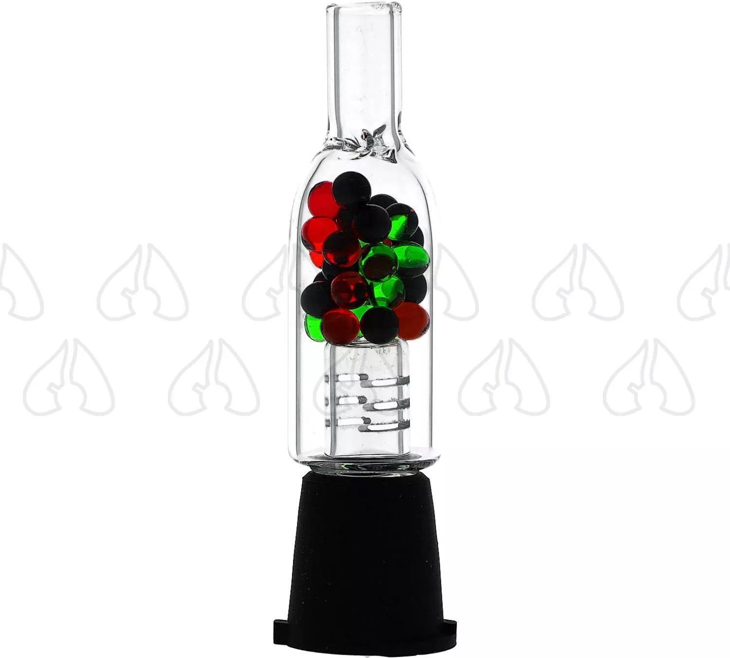 Ustnik Jet 420VAPE do waporyzatora Venty Storz & Bickel Unikalny ustnik JET z kulkami do waporyzatora Venty polskiego producenta 420VAPE. Wykonany z odpornego na zniszczenia borokrzemowego szkła. Ustnik z adapterem - gotowy zestaw do wpięcią do jednostki. Ustnik JET to doskonała propozycja dla tych, którzy szukają nowych doznań w trakcie waporyzacji z waporyzatorem Venty. Zaopatrzony jest w wielokolorowe, szklane kulki, które usprawniają przepływ powietrza oraz wychwytują mikro-drobiny suszu zanim trafią one do Twoich ust. Ustnik JET 420VAPE, dzięki zastosowaniu wysokiej jakości borokrzemowego szkła absorbuje ciepło oraz daje uczucie chłodnej pary w ustach. Korzystnie wpływa na smak oraz sprawia, że inhalacja staje się łagodniejsza dla gardła. Lubisz łagodną waporyzację, zależy Ci na najlepszym smaku? Sprawdź jak działa zaprojektowany w Polsce ustnik JET by 420VAPE do waporyzatora Venty! W zestawie otrzymujesz: szklany ustnik Jet 420VAPE z adapterem do waporyzatora Venty