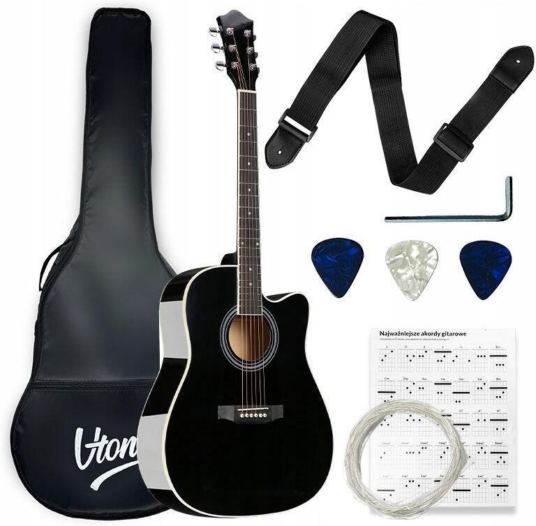V-TONE AG TWO BK Gitara akustyczna 4/4 czarna Do nauki Dla początkujących Kostki Pasek Zapasowe struny Pokrowiec Akordy Klucz regulacyjny V-TONE AG TWO BK – wysokiej jakości gitara akustyczna o szerokiej gamie zastosowań! Gitara akustyczna V-TONE AG TWO BK w kolorze czarnym jest doskonałym wyborem do nauki gry w różnych miejscach. Możesz ją zabrać ze sobą na letni biwak, gdzie jej dźwięk dopełni wieczory przy ognisku. Świetnie sprawdzi się również w domowym zaciszu, gdzie można spokojnie ćwiczyć akordy bez zakłócania spokoju sąsiadów. Co więcej, jest idealna do lokalnych występów w małych kawiarniach czy na spotkaniach towarzyskich, gdzie wysoki połysk jej wykończenia i unikalny kształt z wcięciem cutawayz pewnością przyciągnie wzrok ✅. W zestawie gitara akustyczna, 3 kostki gitarowe, pasek, zapasowe struny, pokrowiec, akordy gitarowe, klucz regulacyjny. Doskonała gitara dla początkujących muzyków i profesjonalistów Gitara V-TONE AG TWO BK została zaprojektowana z myślą o początkujących muzykach, którzy dopiero zaczynają swoją przygodę z gitarą, ale również o doświadczonych profesjonalistach. Dzięki 20 progom i menzurze 648 mm, gitara ułatwia grę i naukę akordów ✅. Liczne akcesoria dołączone do gitary sprawiają, że nie musisz martwić się o dodatkowe zakupy, co jest dużą zaletą dla osób zaczynających swoją muzyczną podróż, jak i profesjonalistów. Zestaw gitarowy w konkurencyjne cenie Jeśli szukasz idealnej gitary do nauki lub rekreacji, V-TONE AG TWO BK jest odpowiedzią na Twoje potrzeby. Ta gitara akustyczna 4/4, której pudło rezonansowe zostało wykonane z drewna lipowego zapewniającego trwałość i świetne brzmienie, jest nie tylko estetyczna, ale również funkcjonalna. Dzięki zamkniętym, chromowanym kluczom gitarowym i mostkowi z drewna orzecha, strojenie gitary jest łatwe i szybkie. Struny gitary są stalowe, dlatego też są mniej podatne na pękanie i zużycie ✅. Wygoda i jakość w jednym V-TONE AG TWO BK to gitara, która łączy w sobie wygodę i jakość. Jej kompaktowe wymiary oraz niewielka waga czynią ją łatwą do noszenia, co jest istotne dla młodych muzyków i osób uczących się gry. Zastosowane materiały wysokiej jakości gwarantują trwałość gitary i komfort podczas gry ✅. Dzięki dołączonemu pokrowcowi, możesz bezpiecznie przechowywać swoją gitarę i zabierać ją ze sobą wszędzie, gdzie tylko chcesz. Jeśli szukasz gitary akustycznej o świetnym brzmieniu w konkurencyjnej cenie, wybierz V-TONE AG TWO BK ✅! Specyfikacja techniczna Kolor: czarny Struny: 6 (stal) Płyta wierzchnia: drewno lipowe Tył i bok: drewno lipowe Podstrunnica: drewno techniczne Mostek: drewno orzecha Siodełko: tworzywo ABS Gryf: drewno okoume Progi: 20 Binding: tworzywo ABS Klucze gitarowe: zamknięte, chromowane Wykończenie: wysoki połysk Rozmiar gitary: 4/4 (41 cali) Pudło rezonansowe: dreadnought Cutaway: tak Pręt regulacyjny: tak Zaczepy na pasek: 2 Menzura: 648 mm Wymiary gitary: Długość: 104,5 cm Szerokość: 41 cm Wysokość: 11,5 cm Wymiary opakowania: 108 x 14,5 x 44 cm Waga netto: 2,2 kg Waga brutto: 3 kg Oryginalne opakowanie i wypełnienie.