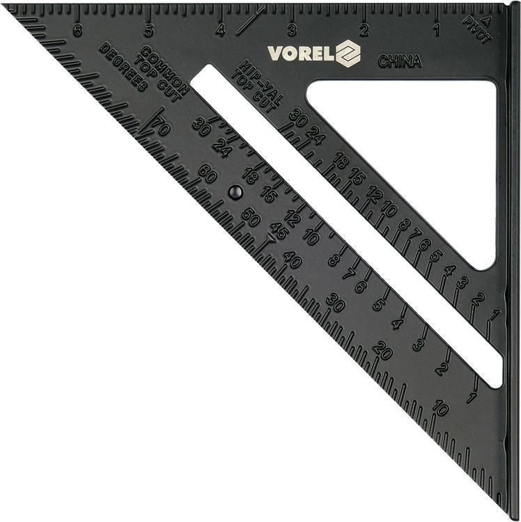 Kątownik aluminiowy ze stopką 250 mm marki VOREL Ekierka/kątownik aluminiowy ze stopką marki Vorel typu T to praktyczne narzędzie pomiarowe, które umożliwia precyzyjne i dokładne mierzenie kątów w różnych zastosowaniach. Jest to niezastąpione podczas prac budowlanych, zwłaszcza montażu tak zwanej suchej zabudowy. Wymiary: 180 x 180 x 250 mm, grubość ok. 2,5 mm. Ten kątownik jest wykonany z utwardzanego aluminium, co zapewnia lekkość, trwałość i odporność na korozję. Jest solidnie wykonany, powierzchnia kątownika jest lakierowana, a to gwarantuje długotrwałe użytkowanie narzędzia. Na krawędziach umieszczono podziałkę milimetrową oraz calową z przeznaczeniem do pomiarów ciesielskich i dekarskich.