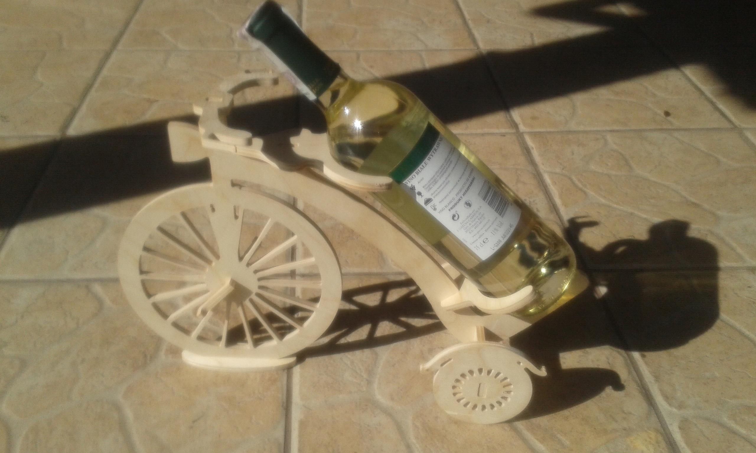 Stojak rower wykonany z eko sklejki gr 6mm bardzo stabilny ze względu na łączenia czopowane z możliwością dodania kleju .Mieści się na nim butelka wina 0.7l W cenę nie jest wliczone wino