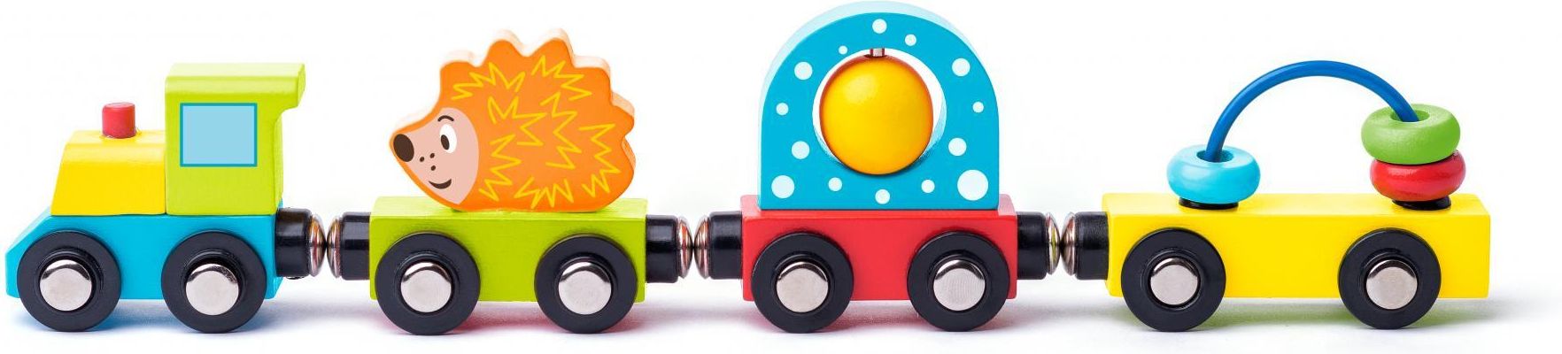 93057 Woody - Pociąg z zabawkami i jeżykiemKolorowy drewniany pociąg z wagonikami to świetna zabawa dla Twojego malucha. Skład zestawu: wagonik ze ślicznym jeżykiem wagonik z kuleczką wagonik z koralikamiZestawy łączą się za pomocą magnesów.Długość pociągu: 27cmWiek: 3+ Wierność tradycji, najwyższa …