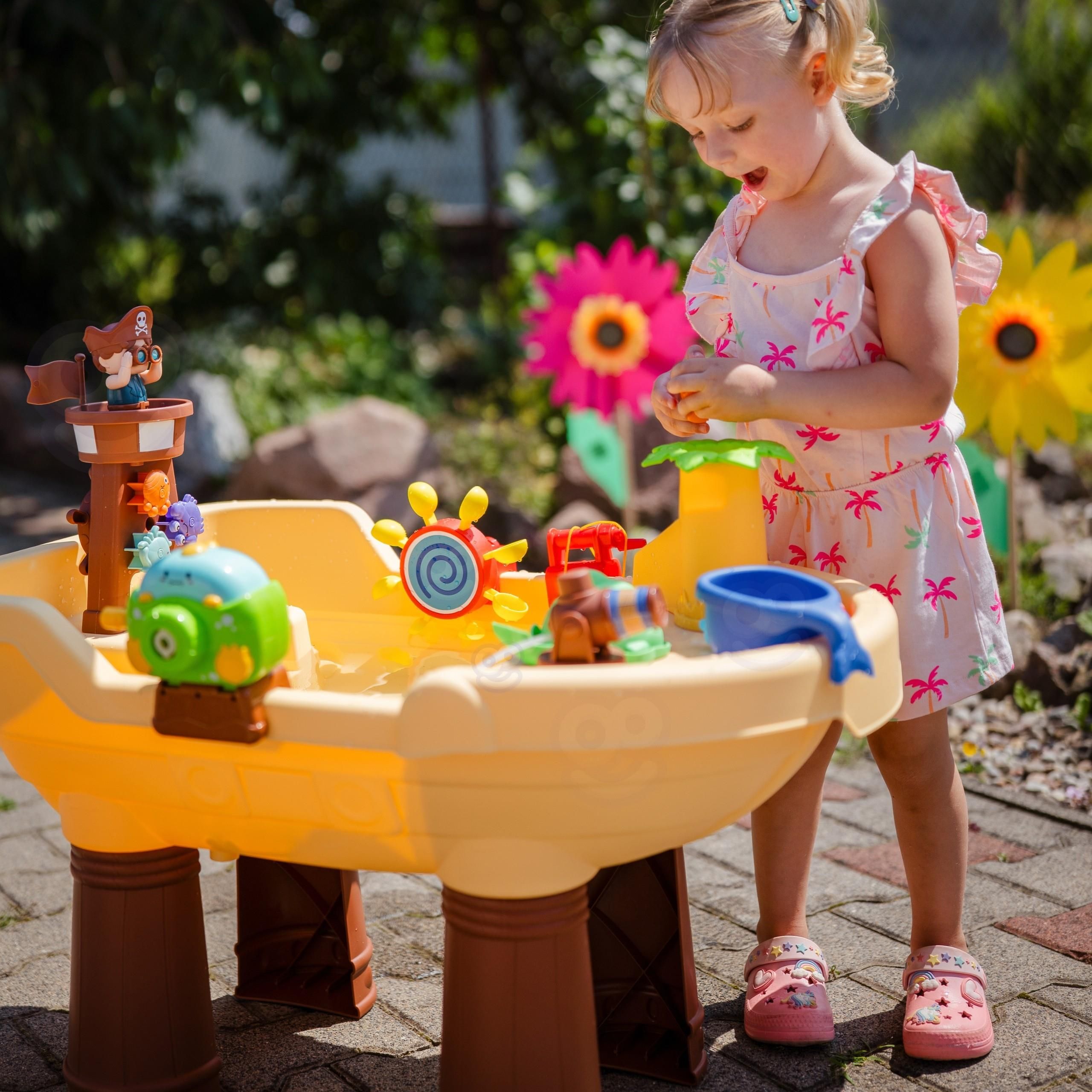 Stolik Wodny Piracka Łódź marki Woopie to niezwykła zabawka, która przenosi dzieci w świat pirackich przygód i zapewnia godziny kreatywnej zabawy na świeżym powietrzu. Dzięki bogatemu zestawowi kolorowych akcesoriów, ruchomym elementom i pirackiej wieży maluchy mogą eksperymentować z wodą, bawić się bąbelkami, kręcić kołem wodnym i odkrywać mnóstwo możliwości zabawy. Prosta, solidna konstrukcja oraz duże rozmiary sprawiają, że stolik jest wygodny i atrakcyjny nawet dla kilku dzieci jednocześnie. Charakterystyka ✔️ Dla dzieci od 3 roku życia ✔️ Stabilna i łatwa w montażu konstrukcja z wytrzymałego tworzywa ✔️ Idealny do ogrodu lub do piaskownicy ✔️ Prosta konstrukcja umożliwiająca szybkie opróżnianie i czyszczenie stolika ✔️ Dzięki dużym rozmiarom stolik umożliwia wspólną zabawę kilku dzieci ✔️ Wszystkie elementy mają zaokrąglone kształty, co zapewnia komfort i bezpieczeństwo podczas zabawy. [img-130526-left-thickbox_default] Zestaw zawiera ✔️ Stolik wodny ✔️ Armatka wodna ✔️ Aparat do bąbelków ✔️ Zjeżdżalnia wodna ✔️ Kotwica ✔️ Maszt z bocianim gniazdem ✔️ Figurka pirata ✔️ 6 małych kół wodnych ✔️ Duże koło wodne ✔️ 3 Pływające zwierzątka ✔️ 4 kubeczki do przelewania wody [img-130533-left-thickbox_default] Zabawka rozwija ✔️ Motorykę ✔️ Koordynację ręka–oko ✔️ Kreatywność ✔️ Wyobraźnię ✔️ Logikę ✔️ Umiejętność rozwiązywania problemów ✔️ Integrację sensoryczną [img-130534-left-thickbox_default]