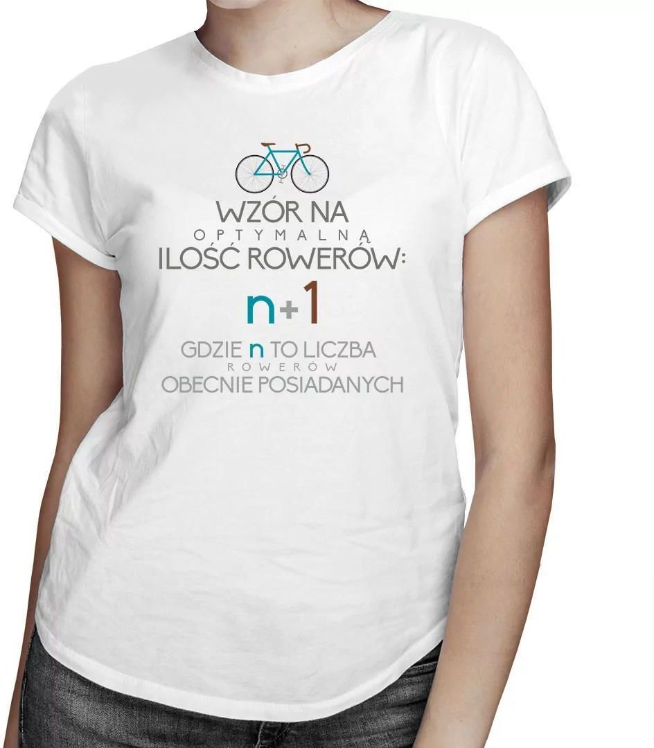 Wzór na optymalną ilość rowerów: n+1 gdzie n to liczba rowerów obecnie posiadanych Koszulka z nadrukiem dla miłośników jazdy na rowerze. Uszyta z przyjemnej w noszeniu bawełny, świetnie sprawdzi się w codziennym użytkowaniu także jako pomysł na prezent.