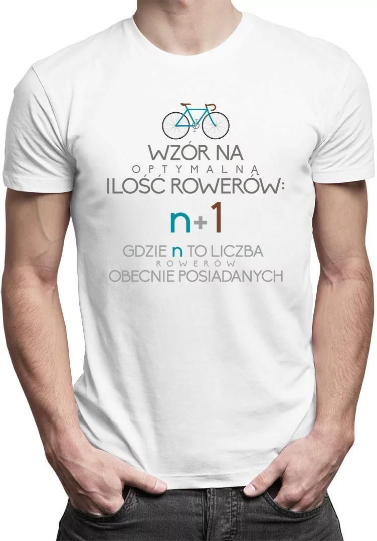 Wzór na optymalną ilość rowerów: n+1 gdzie n to liczba rowerów obecnie posiadanych Koszulka z nadrukiem dla miłośników jazdy na rowerze. Uszyta z przyjemnej w noszeniu bawełny, świetnie sprawdzi się w codziennym użytkowaniu także jako pomysł na prezent.