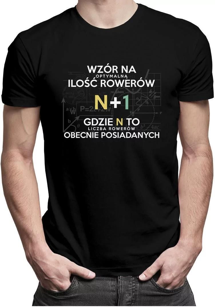 Wzór na optymalną ilość rowerów: n+1 gdzie n to liczba rowerów obecnie posiadanych Koszulka z nadrukiem. Idealna na prezent. Wykonana z grubej, miłej w dotyku, wysokiej jakości bawełny.