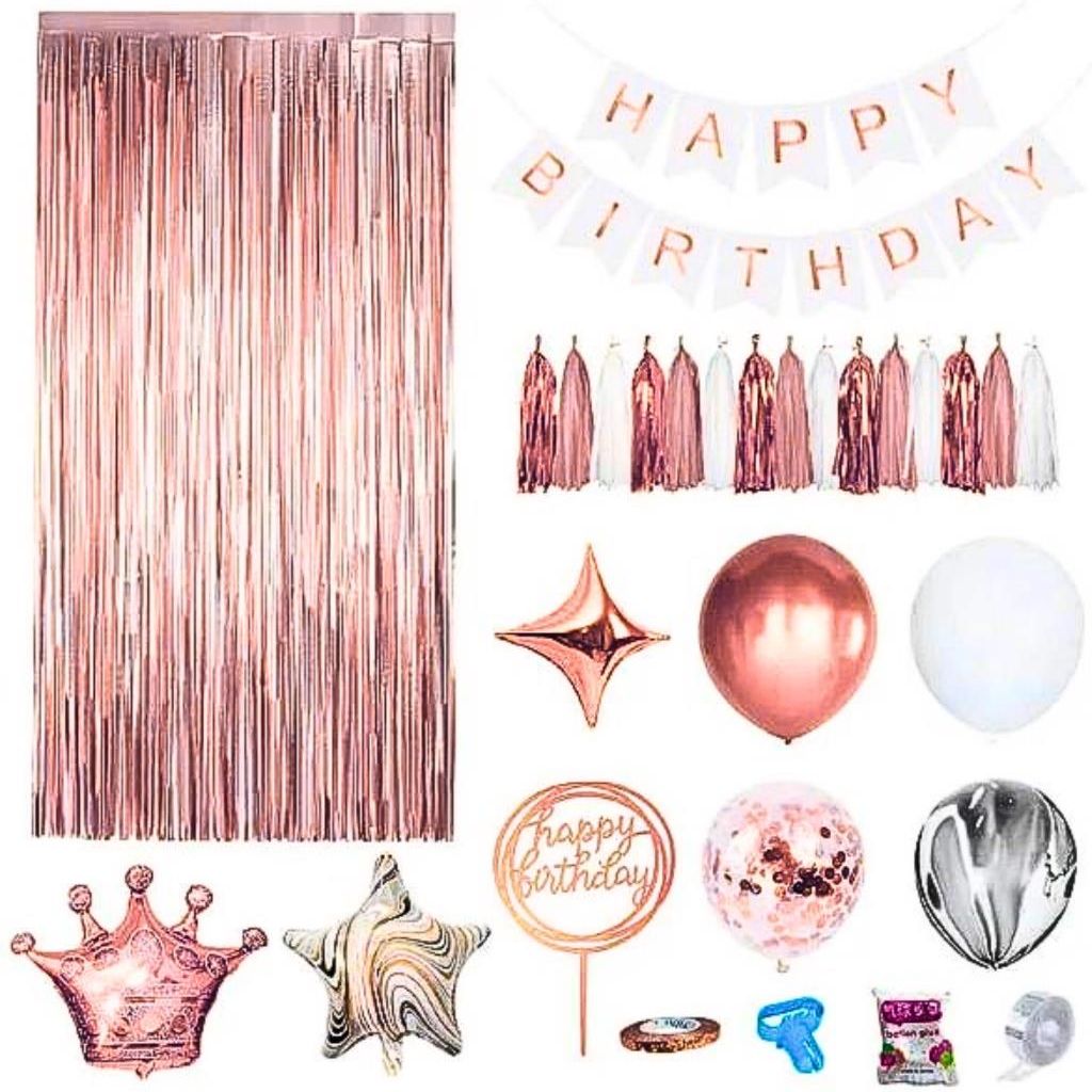 Zestaw Balonów Dekoracyjnych Na Urodziny 65 Sztuk Rose GoldElementy dekoracyjne na idealną uroczystość urodzinową! Ten zestaw zawiera wszystko, co niezbędne do stworzenia nieskazitelnej dekoracji na przyjęcie urodzinowe lub inną specjalną okazję. Mając wszystkie podstawowe narzędzia w zestawie, możesz łatwo i szybko złożyć balony, tworząc spektakularną atmosferę w kilka chwil. Spraw, aby impreza Twojego najlepszego przyjaciela była niezapomniana dzięki tej oszałamiającej dekoracyjnej niespodziance.Zestaw zawiera60 balonów w różnych kolorach1x balon w kształcie korony2x balony w kształcie pięcioramiennej gwiazdy2x balony w kształcie czteroramiennej gwiazdy1x kurtyna z błyszczących wstążek1x baner happy birthday5x zestaw kolorowych ozdobnych frędzli1x dekoracja tortu happy birthdayOzdobna wstążka, akcesoria do wiązania balonów, klej i taśma do mocowania balonów.WymiaryBalon korona: 71cm x 66cmNapisy happy birthday: 152cm - 300cmLiterki: 16.5cm x 20.3cmLizak: 17cmWstążki: 3x 140cmNa różne okazjeWieczór panieńskiSpraw, aby wieczór panieński twojej najlepszej przyjaciółki był niezapomniany dzięki tej oszałamiającej dekoracji niespodziance.ImprezaDodaj trochę emocji do imprezowej atmosfery.UrodzinyIdealny zestaw do upamiętnienia różnych rocznic i urodzin.Elementy dekoracyjne na idealne przyjęcie urodzinoweIdealna dekoracjaW tym zestawie znajdziesz wszystkie niezbędne elementy do stworzenia nienagannej dekoracji na przyjęcie urodzinowe lub inną specjalną okazję.Łatwy montażDzięki wszystkim niezbędnym narzędziom można bez wysiłku i szybko złożyć balony, uzyskując spektakularną atmosferę w ciągu kilku chwil.