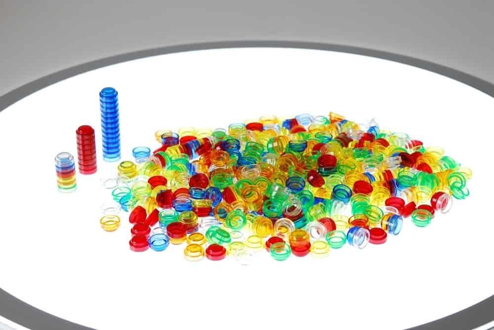 Zestaw do nauki liczenia Montessori TickiT - 500 szt Półprzezroczyste plastikowe klocki Montessori w 6 kolorach, które można układać w stosy lub używać do liczenia, sortowania, tworzenia wzorów i sekwencjonowania. W wygodnym pojemniku do przechowywania. Zestaw do nauki liczenia pobudza następujące obszary: • Rozwój fizyczny - umiejętności motoryczne • Rozumowanie świata - kolor • Matematyka - liczenie i sortowanie Rozmiar: 20 mm. Odpowiedni dla dzieci od 3 lat.