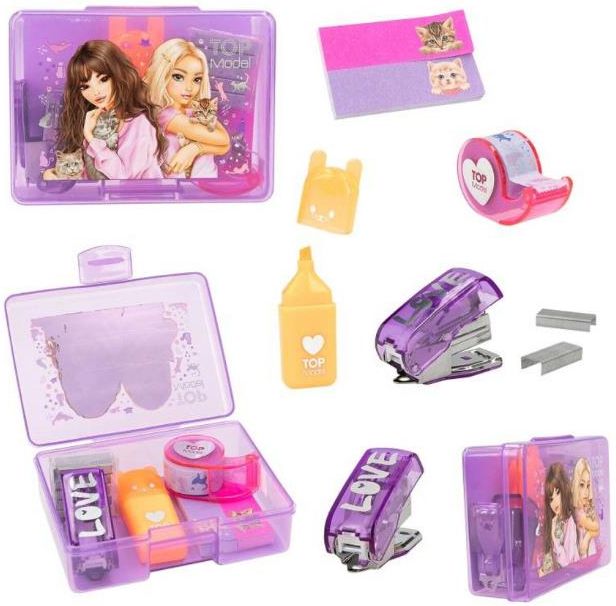 ZESTAW NA BIURKO MINI - TOP MODEL Producent: Depesche Kod produktu: 12246 Zalecany wiek: 5 lat + Wymiary opakowania: 9 x 6,5 x 3 cm Waga: 0,07 kg Mały zestaw na biurko od TOP MODEL. Zawiera 1 zszywacz z igłami zszywacza do uzupełniania, 1 dozownik taśmy z 4 m kolorowo zadrukowanej taśmy, 2 małe bloki karteczek samoprzylepnych i zakreślacz. Dwa projekty: fioletowe pudełko z uroczym motywem kota na wieczku, jeszcze więcej uroczych wzorów kotów na poszczególnych przyborach i pomarańczowy zakreślacz. Różowe pudełko z fajnymi modelami na wieczku, a także na poszczególnych elementach biurka i różowym zakreślaczu. Zszywki: szerokość 10 mm, wysokość 5 mm * Występuje w dwóch wersjach kolorystycznych. Kolor wysyłany losowo, według dostępności.