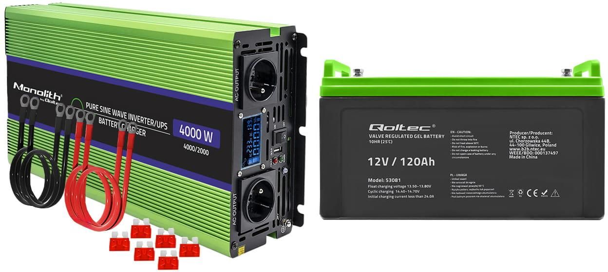 Zestaw: przetwornica napięcia Qoltec Monolith UPS 12V/230V 2000W/4000W + akumulator żelowy Qoltec GEL Professional LongLife 12V 120Ah Katowice