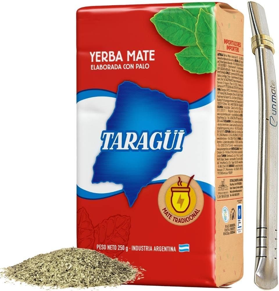 Zestaw Taragui z bombilla W skład zestawu wchodzi: Una Bombilla od Un Mate Bombilla do yerba mate wykonana ze stali nierdzewnej firmowana przez argentyńską firmę UN MATE.Dlaczego jest bestsellerem? Bombilla została wykonana ze stali nierdzewnej INOX. Materiał ten gwarantuje długie i bezproblemowe użytkowanie. Inwestycja na lata! Ma ergonomiczny kształt oraz szeroki ustnik przez co bardzo wygodnie się z niej pije napar a sama rurka bardzo dobrze „leży” w naczyniu. Dobra filtracja: z 95% markami yerb poradzi sobie bez problemu a przy odrobinie wprawy przefiltruje nawet drobniej zmielone yerby. Górna część bombilli i ustnika jest lekko zagięta przez co komfort picia jest jeszcze większy. Uniwersalna: sprawdzi się doskonale w połączeniu z większością naczynek dostępnych na rynku. Idealna długość: przez wielu Mateistów długość bombilli pomiędzy 16 a 17 cm jest uważana za idealną. Wygląd i estetyka to dla firmy Un Mate priorytet dlatego bombilla została zapakowana w gustowny kartonik a w środku zabezpieczona folią. Jej spłaszczony profil oraz szeroki ustnik zdecydowanie wyróżnia ją na tle konkurencji. Drugiej takiej nie znajdziesz! Trwałość: wysokiej jakości stali nierdzewnej z której wykonana została bombilla zapewnia łatwość w utrzymaniu, 100% bezpieczeństwo w kontakcie z żywnością oraz bardzo długą żywotność produktu. Inwestycja na lata! Yerba mate Taragui 250g Flagowy produkt z jednej z największych argentyńskich plantacji yerba mate na świecie: Las Marias. Od wielu lat jest numerem jeden w Argentynie i cieszy się popularnością na całym świecie.Jest to dobra i klasyczna pozycja dla wszystkich tych, którzy chcą wejść w świat yerba mate i zacząć od klasyki.Dodatkowe informacje:Długość bombilli: 16 cmGramatura yerba mate: 250g