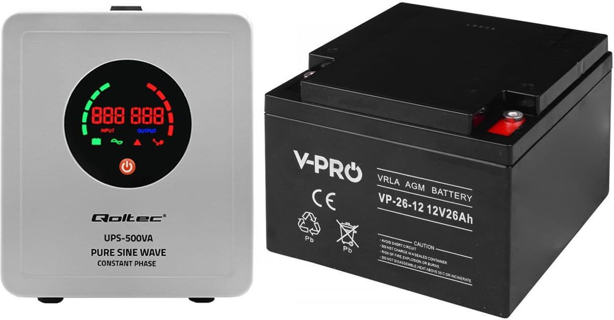 Zestaw: zasilacz awaryjny Qoltec Pure Sine Wave UPS 500VA/350W SF + akumulator Volt VPRO VRLA AGM 12V 26Ah Katowice