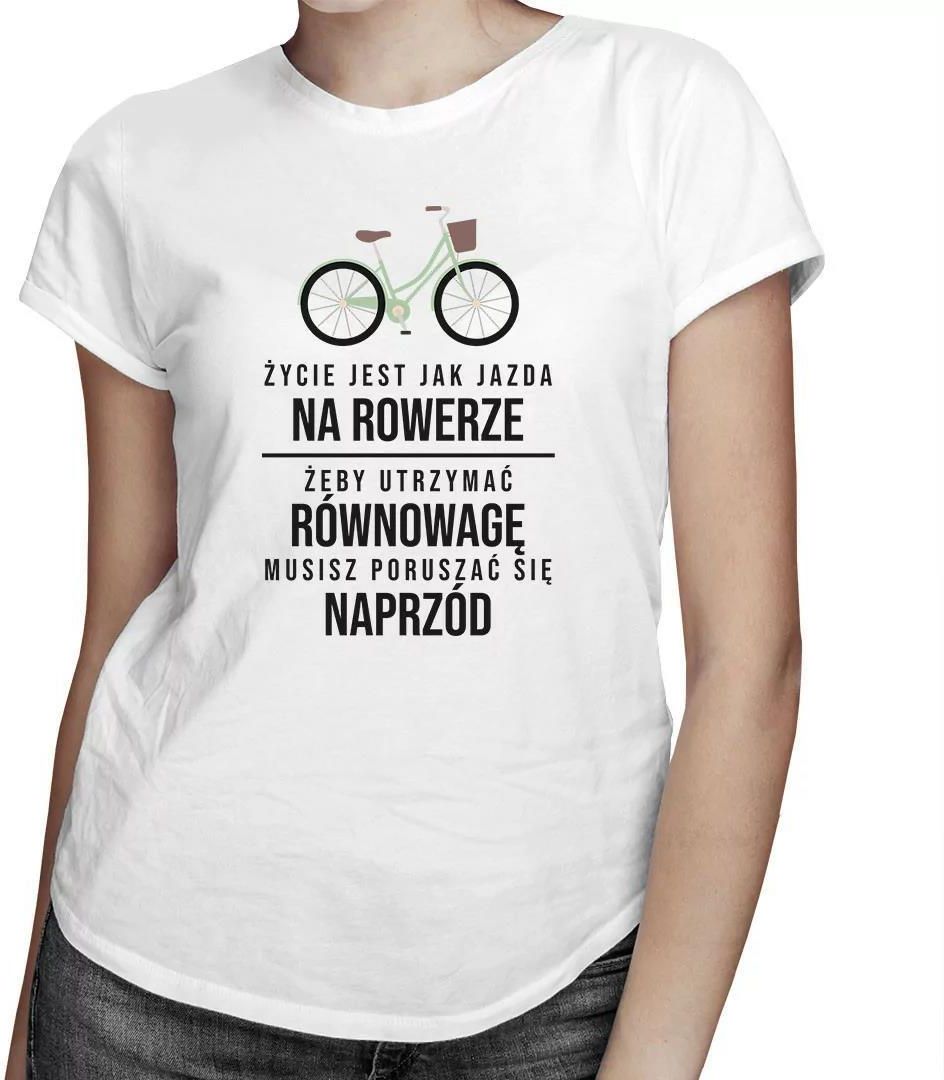 Życie jest jak jazda na rowerze - żeby utrzymać równowagę musisz poruszać się naprzód Koszulka z nadrukiem dla miłośników jazdy na rowerze. Uszyta z przyjemnej w noszeniu bawełny, świetnie sprawdzi się w codziennym użytkowaniu także jako pomysł na prezent.