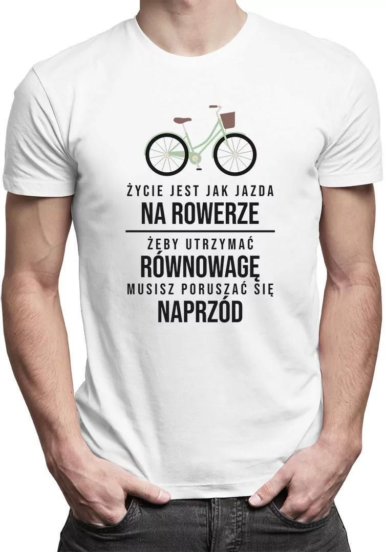 Życie jest jak jazda na rowerze - żeby utrzymać równowagę musisz poruszać się naprzód Koszulka z nadrukiem dla miłośników jazdy na rowerze. Uszyta z przyjemnej w noszeniu bawełny, świetnie sprawdzi się w codziennym użytkowaniu także jako pomysł na prezent.