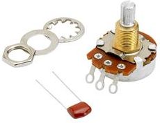 Fender 0990830000 Split 250K potencjometr do gitary Najwyższej jakości potencjometry używane w amerykańskich instrumentach Fender . 250K jest zwykle związane z większością przetworników single-coil. Może być używany jako Volume lub Tone Średnica osi potencjometru 3/8 " Konstrukcja osi: split. Współpracuje z pokrętłami push-on (bez śruby ustalającej). Pasuje do prawie wszystkich instrumentów Fender (USA i Meksyk) W opakowaniu: nakrętka, podkładka, kondensator 0,022 mF 250V 099-0830-000, 0990830000