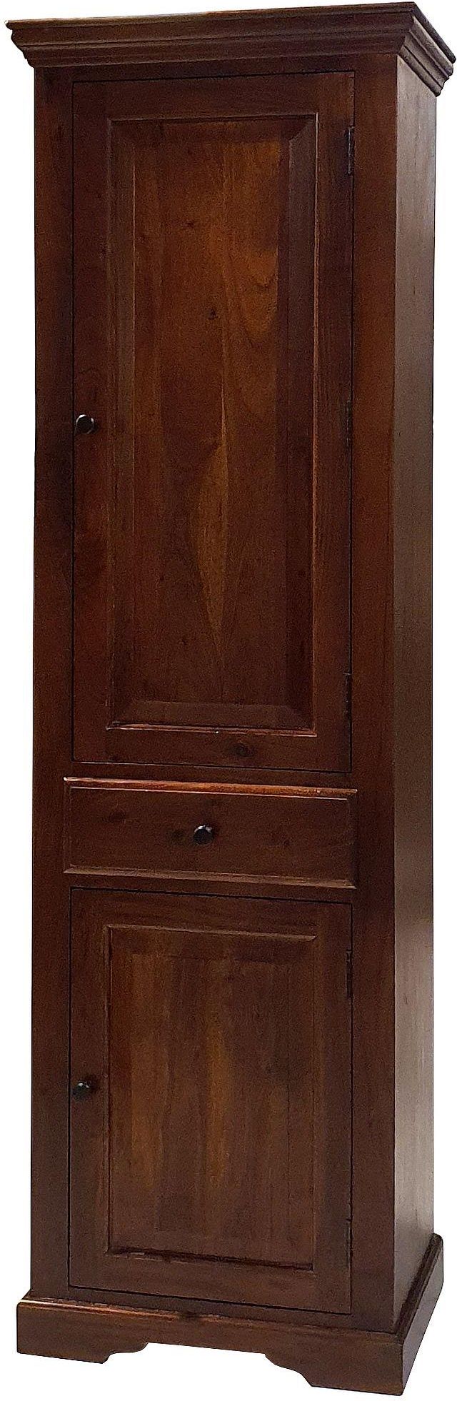 Szerokość: 60cm/Głębokość: 45cm/Wysokość: 195cm/ Kod produktu: 99-L043AL/Wąska klasyczna szafa rzeźbiona z drewnaCechy mebla: * wąska szafa wykonana z drewna akacji * jedna drewniana szuflada * wyposażony w wiele półek krytych drzwiami z drewna * wysunięty frezowany gzyms Jednodrzwiowa szafa w stylu kolonialnym, wykonana z wysokiej jakości drewna akacjowego w kolorze ciepłego brązu. Mebel wyposażony jest w 5 półek ukrytych za drewnianymi drzwiczkami oraz 1 praktyczną szufladę, co zapewnia wygodne przechowywanie różnych przedmiotów.Szafa nawiązuje stylistyką do klasycznego kolonialnego stylu dzięki frezowanym drzwiczkom, dekoracyjnemu zwieńczeniu oraz eleganckiej stopie. Solidne drewno oraz ręczne wykonanie wraz z widoczną strukturą słojów nadają meblowi niepowtarzalny charakter.Idealny wybór do przedpokoju, sypialni, garderoby lub do gabinetu jako szafa na dokumenty. Całość zabezpieczona bezbarwnym lakierem o wykończeniu satynowym. Kolekcja: LONDON Materiał: 100% drewno akacja indyjska Kolor: Ciepły brąz Wykończenie: Satyna Co wyróżnia nasze meble na tle konkurencji: meble wykonane z grubej litej deski konstrukcja z litego drewna całość mebla wykonana jest w 100 % z drewna (korpus, plecy, półki, dna szuflad) nie stosujemy wyrobów drewnopodobnych (płyt wiórowych, sklejki, płyt MDF i forniru) Są to elementy, na które rzadko zwraca się uwagę podczas zakupu mebli i których nie widać na zdjęciach, ale mają one jednak ogromny wpływ na trwałość i wytrzymałość mebli podczas ich użytkowania. Informacja dodatkowa: Drewno jest produktem w 100% pochodzenia naturalnego, w którym mogą występować delikatne przebarwienia, sęki lub pęknięcia. Wszystkie wymienione elementy są profesjonalnie wypełnione odpowiednią masą szpachlową, która w sposób estetyczny maskuje je i dodatkowo zabezpiecza mebel. Takie zjawiska są naturalną cechą drewna i jako takie nie podlegają reklamacjom. więcej informacji tutaj -->
