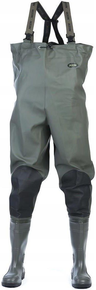 JAXON WODERY SPODNIOBUTY PRESTIGE PLUS ROZ. 42 Wodery wędkarskie do piersi Jaxon Prestige Plus AB-PSE. Profesjonalne wodery wędkarskie wykonane ze specjalnego wodoodpornego tworzywa Plavitex. Wodery znacznie bardziej komfortowe, zapewniające dużo większą swobodę ruchów od standardowych gumowych woderów. Niezbędne wyposażenie każdego wędkarza chcącego skutecznie łowić na spinning lub muchę. Wodery wyposażone w mocne i zarazem komfortowe szelki z możliwością regulacji długości. Znakomitym elementem woderów są specjalne wzmacniane wstawki w okolicy kolan, świetnie ochraniające nogi podczas chodzenia w odstających zaroślach i krzakach. Wodery dobrze sprawdzają się podczas łowienia zarówno w porze jesienno-zimowej, kiedy woda jest zimniejsza jak i w letnie wypady nad rzekę, jezioro lub morze. Zintegrowane gumowe buty również posiadają dodatkowe zabezpieczające warstwy ochronne, podeszwa wyposażona w protektor zapewniający ochronę i wygodę podczas chodzenia po nierównym wyboistym podłożu. PARAMETRY Kod : AB-PSE42 Rozmiar : 42 Kolor : Zielony Długość wkładki: 27 cm Długość wewnętrzna nogawki: 88 cm Obwód pasa: 116 cm