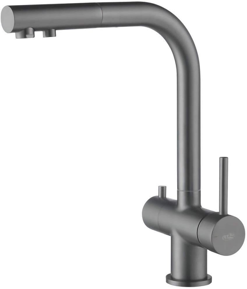 Blue Water Apala to bateria czterodrożna przeznaczona do podłączenia wody wodociągowej i filtrowanej. W baterii Apala zastosowano dwa niezależne obwody. Blue Water Apala Bateria czterodrożna w kolorze grafit (gun metal) Apala to czterodrożna bateria, zaprojektowana do podłączenia wody wodociągowej oraz filtrowanej. Bateria została wyposażona w obracaną, wyciąganą wylewkę o pełnym zakresie ruchu wynoszącym 360°. Głowice ceramiczne gwarantują cichą i wydajną pracę baterii, umożliwiają płynną i precyzyjną regulacje zarówno temperatury i natężenia przepływu, a dzięki wbudowanym perlatorom woda zostaje napowietrzona, co redukuje jej zużycie, jednocześnie zachowując pełną jakość strumienia. Posiada cztery ujęcia wody: woda ciepła oraz zimna, woda filtrowana czysta w dwóch wersjach: woda czysta i woda zmineralizowana. Model Apala zachwyca nowoczesnym designem, a jednocześnie zapewnia wygodę i funkcjonalność każdego dnia. Dwa niezależne obwody Bateria Blue Water Apala posiada dwa niezależne obwody. Prawe pokrętło umożliwia regulację temperatury poprzez mieszanie wody ciepłej i zimnej. Natomiast lewe pokrętło pozwala na korzystanie z czystej, przefiltrowanej wody, na przykład z systemu odwróconej osmozy. Dodatkowe informacje Materiał: stal nierdzewna Wykończenie: grafit (gun metal) Wylewka obrotowa do 360° Głowice ceramiczne Dwa perlatory, cztery ujęcia wody: woda ciepła oraz zimna, woda filtrowana czysta w dwóch wersjach: woda czysta i woda zmineralizowana Dwa elastyczne wężyki podłączeniowe 3/8“ – 400 mm Dwa podłączenia do filtra z szybkozłączką (do wody filtrowanej oraz zmineralizowanej) rączka mieszacza odchyla się do przodu, dzięki czemu można montować baterię pomiędzy zlewozmywakiem podwieszanym a ścianą Wymiary: rysunek techniczny baterii dostępny na dole strony produktu Rysunek techniczny baterii czterodrożnej Apala Atest higieniczny PZH