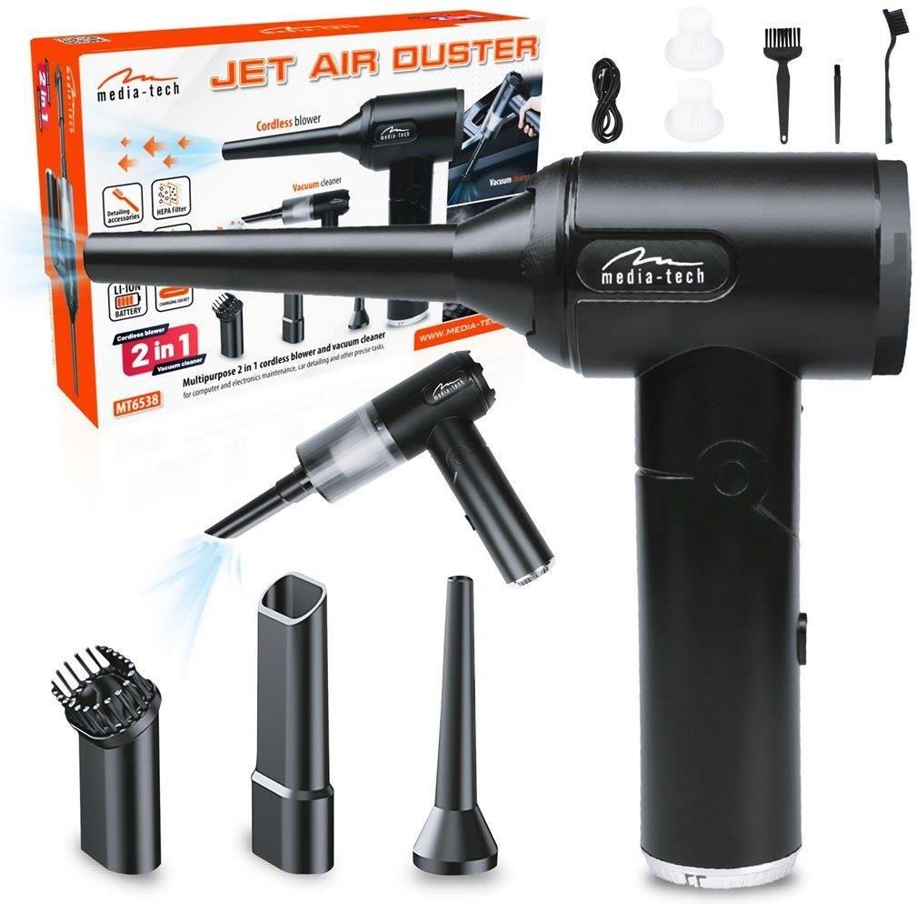 DMUCHAWA BLOWER ODKURZACZ BEZPRZEWODOWY 2 W 1 JET AIR DUSTER Weź kontrolę nad czystością - Funkcje JET AIR DUSTER MT6538 Dmuchawa i odkurzacz 2 w 1 – Łączy w sobie dwie funkcje, dzięki czemu jednym urządzeniem usuniesz kurz, pył i okruchy z klawiatury, komputera czy wnętrza samochodu. Moc 6800 Pa i nadmuch 30 m/s – Wydajny silnik zapewnia silny strumień powietrza, który dociera do trudno dostępnych miejsc i gwarantuje szybkie, dokładne czyszczenie. Lekka i składana konstrukcja – Waży zaledwie 340 g i ma składaną rączkę, co ułatwia codzienne użytkowanie oraz przechowywanie w domu czy podróży. Wbudowane oświetlenie LED – Diody LED oświetlają powierzchnię roboczą, co pozwala czyścić w ciemnych zakamarkach, np. wewnątrz obudowy komputera. Akcesoria i filtry HEPA – W zestawie znajdują się końcówki, szczoteczki oraz dwa zmywalne filtry HEPA. Gwarantują one wszechstronne zastosowanie i skuteczne zatrzymywanie pyłu. Kluczowe cechy produktu Silnik wysokiej prędkości – 56 000 rpm gwarantuje efektywną pracę Moc ssania 6800 Pa – pozwala usunąć nawet drobny kurz i pył Naddmuch 30 m/s – skutecznie oczyszcza trudno dostępne miejsca USB‑C – szybkie i wygodne ładowanie Wymiary i waga – 100×164×55 mm, 340 g, łatwe przechowywanie i transport Wbudowany akumulator – do 13 minut pracy bez podłączania do sieci Zadbaj o sprzęt jak profesjonalista – wybierz Jet Air Duster MT6538! Odkryj wydajność i wygodę nowej bezprzewodowej dmuchawy i odkurzacza Media-Tech Jet Air Duster MT6538, stworzonej z myślą o szybkim i precyzyjnym sprzątaniu w domu, biurze i samochodzie. Ta kompaktowa dmuchawa 2 w 1 łączy w sobie mocny silnik, lekką konstrukcję i ergonomiczny design, oferując wszystko, czego potrzebujesz, aby w kilka chwil pozbyć się kurzu, pyłu i okruchów nawet z trudno dostępnych miejsc. Dmuchawa i odkurzacz 2 w 1 Jet Air Duster MT6538 łączy funkcję dmuchawy i odkurzacza w jednym urządzeniu. Silny strumień powietrza o mocy 6800 Pa oraz nadmuch 30 m/s pozwala szybko oczyścić komputery, klawiatury, wnętrze samochodu czy biurko. Dzięki wbudowanemu akumulatorowi i lekkiej konstrukcji sprzątanie jest wygodne, precyzyjne i komfortowe przez dłuższy czas. W odróżnieniu od standardowych dmuchaw, Jet Air Duster MT6538 oferuje mocny strumień powietrza i precyzyjne działanie, dzięki czemu sprzątanie jest szybsze, dokładniejsze i wygodniejsze. Specyfikacja techniczna Typ urządzenia: bezprzewodowa dmuchawa + odkurzacz 2 w 1 Moc ssania: 6800 Pa Naddmuch: 30 m/s Obroty silnika: 56 000 rpm Waga: 340 g Wymiary: 100×164×55 mm Zasilanie: USB‑C Akumulator: do 13 minut pracy Akcesoria: końcówki, szczoteczki, 2 filtry HEPA Oświetlenie: wbudowane diody LED Potężny strumień powietrza Zaawansowany silnik generuje niezwykle mocny strumień powietrza, który skutecznie usuwa kurz, okruchy i pył z nawet najbardziej trudno dostępnych miejsc. Dzięki temu Jet Air Duster MT6538 sprawdza się nie tylko przy czyszczeniu elektroniki, ale także w samochodzie czy w domu. Kompaktowa konstrukcja i wygodny uchwyt sprawiają, że korzystanie z urządzenia jest komfortowe, a wysoka wydajność pozwala na szybkie i dokładne sprzątanie bez użycia chemii czy jednorazowych puszek ze sprężonym powietrzem. Bezprzewodowa dmuchawa i odkurzacz 2 w 1 Media-Tech Jet Air Duster MT6538 to profesjonalne narzędzie, które łączy w sobie wszystkie najważniejsze cechy: mocny strumień powietrza, wszechstronność zastosowań, kompaktowe wymiary i wygodę użytkowania. Dlaczego warto kupić ten produkt Szybkie i wygodne czyszczenie – usuwa kurz i pył w kilka chwil, nawet z trudno dostępnych miejsc Komfortowa obsługa – lekka i ergonomiczna konstrukcja ułatwia pracę przez dłuższy czas Wszechstronność – idealna do elektroniki, samochodu, biura i domu Precyzyjna kontrola – wbudowane LED pomagają w dokładnym sprzątaniu Gotowa do użycia – komplet akcesoriów i filtry HEPA pozwalają natychmiast rozpocząć pracę Mobilność – akumulator pozwala działać bez gniazdka do 13 minut Trwałość i bezpieczeństwo – solidne materiały i filtr HEPA chronią sprzęt i użytkownika Nie czekaj! Zainwestuj w BEZPRZEWODOWĄ DMUCHAWĘ I ODKURZACZ 2 W 1 JET AIR DUSTER MT6538, która ułatwi szybkie i precyzyjne czyszczenie w domu, biurze i samochodzie. Dlaczego warto kupić od oficjalnego konta Media-Tech na Allegro? Wybierając zakup z oficjalnego konta Media-Tech na Allegro, masz pewność, że otrzymujesz produkt prosto od producenta – bez pośredników, niepewnego pochodzenia czy ryzyka związanego z nieautoryzowaną sprzedażą. To bezpośredni dostęp do pełnej i aktualnej oferty marki, stworzonej z myślą o komforcie i bezpieczeństwie użytkownika. Kupując od Media-Tech, zyskujesz Dostęp do najnowszych wersji produktów – oficjalne konto jako pierwsze prezentuje nowe modele oraz zaktualizowane serie urządzeń, dzięki czemu masz pewność, że kupujesz sprzęt zgodny z aktualnymi trendami i wymaganiami technologicznymi. Bezpośredni kontakt z marką – wszelkie pytania, sugestie czy potrzeby możesz kierować bezpośrednio do producenta, który najlepiej zna swoje produkty i może udzielić najbardziej precyzyjnych informacji. Oficjalne konto Media-Tech to także regularne nowości, edycje specjalne oraz pełen wybór akcesoriów i kompatybilnych urządzeń – zawsze zgodnych z najnowszymi standardami technologicznymi. To najlepszy sposób, by kupować świadomie, bez ryzyka i z pełną wiedzą o produkcie. pewność oryginalności – każdy produkt pochodzi bezpośrednio od źródła, dokładne i rzetelne opisy – w pełni zgodne ze stanem faktycznym, profesjonalne wsparcie – zespół zna produkty od podstaw, bo sam je projektuje i wprowadza na rynek, Najczęściej zadawane pytania (FAQ) Jak długo działa Jet Air Duster MT6538 na jednym ładowaniu? Akumulator pozwala na pracę do 13 minut bez podłączania do s