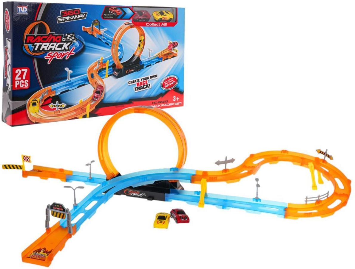 Opis Tor Wyścigowy 27el. Duży, ekstremalny tor wyścigowy z ostrymi zakrętami, pętlami i dwoma autkami w zestawie, to propozycja dla dzieci od 3-go roku życia. Zestaw składa się z 27 elementów do samodzielnego montażu. Na torze znajdują się odcinki proste, ostre zakręty z barierkami zabezpieczającymi przed wypadaniem pojazdu z trasy, dwa poziomy, a także pętla 360 stopni. Pojazdy dołączone do zestawu posiadają napęd pull back. Wymiary tor ok. 88 cm x 75 cm x 23 cm, autko ok. 7 cm x 2,5 cm x 3,5 cm, opakowanie ok. 55,5 cm x 31,3 cm x 7 cm Zawartość zestawu elementy konstrukcyjne toru, 2 x samochodzik, naklejki dekoracyjne.