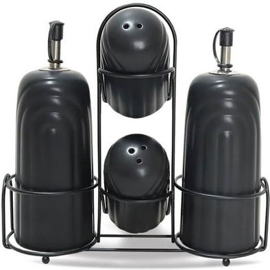 MR-20006-04S Zestaw do przypraw 5 elementów "LINE WORK" • materiał: ceramika • solniczka, pieprzniczka – pojemność: 100 ml • wymiary: 9 x 5,5 cm • butelka do octu, butelka do oleju - pojemność: 300 ml • wymiary: 17,5 x 6 cm • stojak stalowy malowany prosz