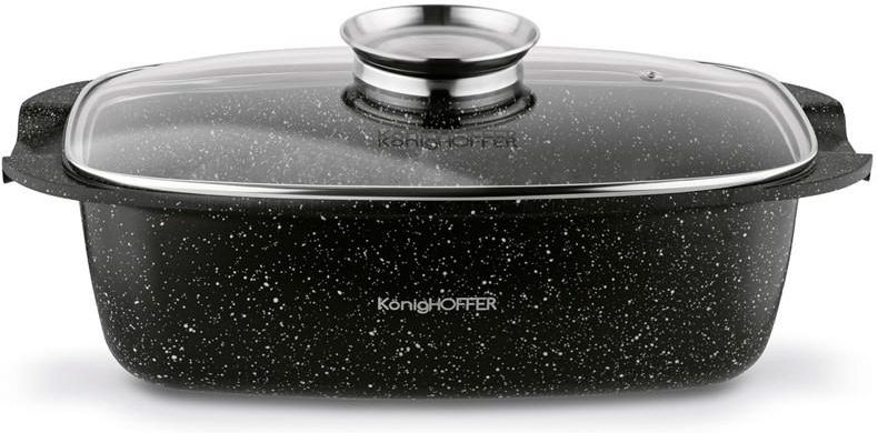 CECHY I ZALETY · Brytfanna jest aluminiowa i wykonana techniką die cast, co znaczy, że jest to wytrzymały oraz lekki odlew z grubymi ściankami · Wiele cykli ścierania oraz dłużej niż klasyczne brytfanny non-stick, może wytrzymać użyta w naczyniu powłoka ceramiczna · Uniwersalne zastosowanie na każdym typie kuchenki dzięki dnu ze wbudowanym dyskiem indukcyjnym · Możliwość użytkowania w piekarniku max. w 200 st. C (bez pokrywki) · Do brytfanny prostokątnej stylizowanej na granitową Kingstone dołączona jest dedykowana pokrywka szklana z nierdzewnym aromatyzerem · Model posiada też dwa duże, odlewane uchwyty, które ułatwią ci przenoszenie pełnego naczynia · Nie musisz przerywać duszenia dań, aby dodać wodę, wino lub oliwę i masz nakładki na uchwyty w zestawie · Duża pojemność, która spełni oczekiwania i sprosta apetytowi rodzinnych świąt lub dużej liczbie gości Brytfanna ceramiczna typu stone Konighoffer Kingstone 5,5 l - duża, na indukcję, z pokrywą i aromatyzerem Z pomocą brytfanny marmurkowej Konighoffer Kingstone możesz z powodzeniem przygotować obiad dla dużej rodziny lub sycący posiłek dla wielu gości. Produkt otrzymał uniwersalną konstrukcję z powłoką ceramiczną oraz wykończeniem zewnętrznym typu Marble. Dzięki temu możesz w niej smażyć, gotować i dusić jedzenie. Korpus brytfanny typu stone został odlany techniką die cast (łącznie z ergonomicznymi uchwytami) z aluminium. Taka konstrukcja gwarantuje użytkownikowi szybką absorpcję ciepła, oszczędność energii oraz równomierne podgrzanie składników dań. Uzupełnia zatem korzyści z dna indukcyjnego, które umożliwia użytkowanie na każdym typie kuchenki. Ceramiczna powłoka wewnętrzna imituje wzór granitu i ułatwia mycie produktu. Sprawia też, że składniki nie przywierają i nie ulegają przypaleniu. Ten rodzaj powierzchni jest bardzo trwały. Jakość powłoki sięga odporności mechanicznej na poziomie wielu tysięcy cykli ścierania. Klasyczne brytfanny non-stick oferują ci wynik aż niższy. Szklana pokrywa to element, który pozwoli ci na zadbanie o efektywne duszenie potraw i regulację pary wodnej wewnątrz naczynia. Jej uchwyt to również aromatyzer. Dzięki niemu możesz stopniowo i automatycznie dodawać niewielkie ilości wina, wody, oliwy i płynnych przypraw bez unoszenia pokrywy. Jest ona przezroczysta, więc możesz na bieżąco kontrolować etap gotowania. Projekt prostokątnej brytfanny ceramicznej Konighoffer Kingstone 5 l - wymiary wewnętrzne 32 x 20,5 x 10,5 cm - jest nowoczesny i elegancki. Model nadaje się też do zapiekania posiłków w piekarniku, maksymalnie w temperaturze 200 st. C (bez pokrywki). Dbając o twój komfort podczas gotowania, produkt ten sprawia, iż każdy kolejny dzień jest zdrowszy i pełen satysfakcji z osiągniętego smaku.