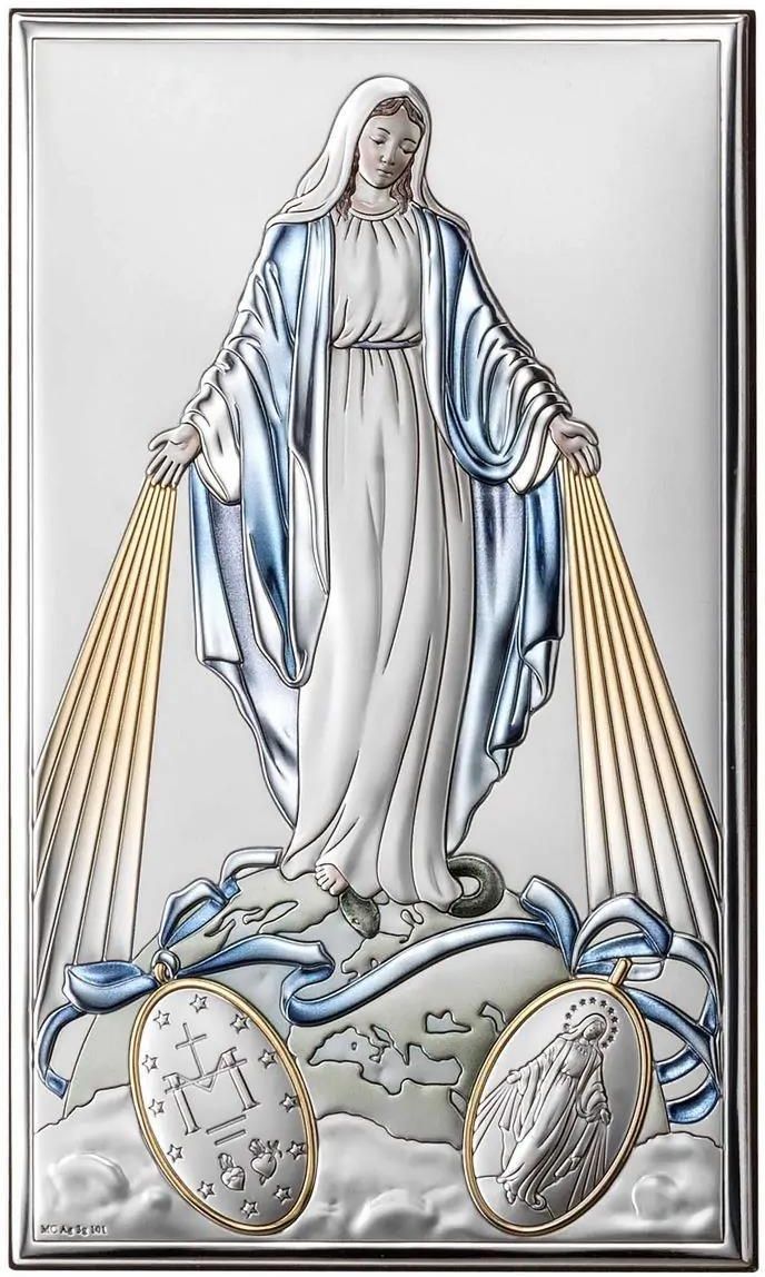 Kultowy obraz Matki Bożej Niepokalanej. Matka Boska Niepokalana to jeden z najbardziej czczonych wizerunków, przez wiernych uważany jest za cudowny. Jest jednym z kultowych symboli chrześcijaństwa w Polsce. Ma wyjątkowe znaczenie i symbolikę religijną. Przywiązywane do niego wartości wspomagają w modlitwie, wierze, a także nawróceniu. To u niej możesz wyprosić u Boga wszystkie łaski. Piękna srebrna reprodukcja z kolorami. Prezentowany srebrny i kolorowy obraz Matki Bożej Niepokalanej w klasycznym prostokątnym kształcie został zaprojektowany i wyprodukowany przez włoską firmę Valenti. Idealne odwzorowanie znanego i kultowego obrazu Matka Boża Niepokalana to kunszt włoskich projektantów. Przedstawia Maryję z rękami opuszczonymi ku dołowi zaś u stóp znajduje się najsłynniejszy medalik świata nazywany Cudownym Medalikiem. Z Jej dłoni wypływają promienie jako symbol "pełnej łaski". Dokładne odwzorowanie szczegółów, na srebrnym emblemacie, takich jak załamanie materiału, czy mimika twarzy postaci wprawi w zachwyt każdego szczęśliwego nabywcę lub obdarowanego. Obraz Matki Boskiej Niepokalanej jest matowy z pięknie lśniącymi elementami, dodatkowo zdobiony kolorami i złoceniami, dzięki czemu wytłoczona postać nabiera eleganckiego wyglądu a obraz otrzymuje niesamowitą kompozycję, co daje spektakularny i wyjątkowy efekt wizualny. Tył obrazka wykonany jest z wysokiej jakości drewna w ciemnym kolorze. Srebrny obraz Matki Bożej jest idealny do zawieszenia i postawienia dzięki specjalnej nóżce. Jego uniwersalność sprawia, że jest idealny jako upominek na wiele różnych okazji. Sprawdzi się doskonale jako wystrój salonu czy jadalni. Obrazek sprawdzi się także w sypialni albo w pokoju dziecka. Świetnie sprawdzi się jako wystrój nowego domu czy plebanii. W każdym miejscu będzie przesłanką do modlitwy czy refleksji. To przepiękne dzieło, które nie tylko zdobi, ale jest także elementem umacniania wiary. Innowacyjna technologia Miro-Silver to wyjątkowa jakość. Obrazek wykonany jest z innowacyjnego metalu o nazwie MIRO-SILVER, pokrytego warstwą czystego srebra 999.95. Metal ten jest opatentowany i wyróżnia się wyjątkowym blaskiem oraz odpornością na uszkodzenia mechaniczne i śniedzenie. Zastosowana technologia umożliwia bardzo łatwe czyszczenie obrazka. Wystarczy użyć miękkiej ściereczki bez żadnych środków szorujących. Bezwzględnie zakazane są wszelkie ściereczki do czyszczenia srebra lub detergenty do srebra, gdyż mogą naruszyć warstwę zabezpieczającą posrebrzany emblemat. Cechy obrazka Materiał: metal posrebrzany Miro-Silver, pokryty warstwą czystego srebra 999,95. Wykończenie: mat, połysk, kolor, złocenia Warianty: obrazek występuje w kilku rozmiarach. Dostępne rozmiary wraz z cenami i dostępnością znajdziesz powyżej. Wymiary całkowite: ok. 6,5 x 11 cm, ok. 9 x 15 cm, ok. 12 x 20 cm. Orientacja: pionowa Mocowanie: nóżka z tyłu do postawienia i otwór do powieszenia. Tył: z ciemnego drewienka. Idealnie pasuje na: chrzest, komunię, jako podziękowania, ślub, rocznicę, nowy dom, święcenia, narodziny dziecka. Doskonały prezent dla: dziewczynki, chłopca, nowożeńców, pary młodej, rodziców, chrzestnych, dziadków, bliskiej osoby, księdza, mamy. Grawerowanie: do wyboru bezpośrednio z tyłu na drewienku lub na płytce do samodzielnego przyklejenia. O szczegółach grawerowania przeczytasz na dedykowanych stronach lub poniżej. Obrazek srebrny z grawerem - zamów ze swoją dedykacją. Obraz Matki Boskiej Niepokalanej uświetnić można dodając piękną i spersonalizowaną dedykację. Obrazek z grawerem to ciekawy i ekskluzywny prezent na wiele ważnych okazji chrześcijańskich takich jak np. komunia, ślub, chrzest. Archanioł to także rewelacyjny pomysł na podziękowania dla chrzestnych czy rodziny lub mamy czy dziadków. Grawerunek tworzymy techniką laserową. Dzięki tej technice masz pewność, że dedykacja pozostanie trwała na długie lata. Na życzenie wykonamy dedykację na metalowej płytce do samodzielnego przyklejenia lub na odwrocie obrazka. Do wyboru masz dużo możliwości personalizacji. Dysponujemy kilkoma rodzajami czcionek i ponad kilkunastoma wzorami graficznymi. Dzięki nim stworzysz swoją indywidualną i wyjątkową dedykację, która ucieszy obdarowaną osobę. Zaufaj naszemu doświadczeniu. Precyzyjnie dobierzemy rozmiar czcionki i ułożenie przesłanego tekstu przez co grawerunek będzie wyglądał rewelacyjnie. Możesz także przesłać nam swoją indywidualną treść dedykacji i grafikę za pomocą e-mail lub udostępnionego formularza. Zachęcamy do zapoznania się ze szczegółami naszej usługi grawerowania laserowego. Liczne opcje personalizacji: czcionki, znaki graficzne, gotowe teksty znajdziesz na dedykowanych stronach w menu lub poniżej. Kupując srebrny obrazek otrzymujesz Piękny, kolorowy i klasyczny obraz Maryi Niepokalanej. Indywidualny grawerunek gratis . Drewnianą nóżkę do postawienia. Opakowanie tekturowe od producenta. Certyfikat autentyczności producenta.