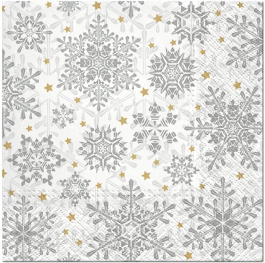Serwetki świąteczne 33x33 Srebrne śnieżynki i złote gwiazdki na białym tle 20szt Serwetki papierowe z nadrukiem. Wymiary: 33 cm x 33 cm (po rozłożeniu). Opakowanie: 20 szt.