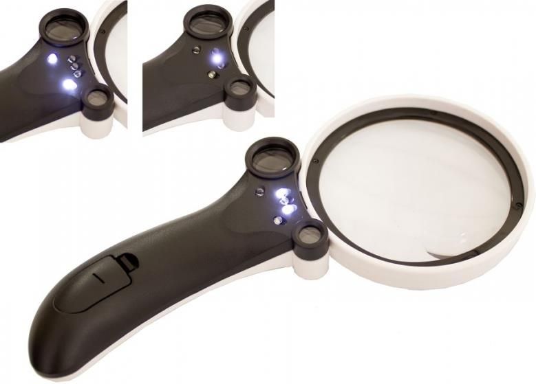 Jesteśmy autoryzowanym sprzedawcą sprzętu marki Levenhuk, dlatego kupując u nas masz pewność że: * Sprzęt pochodzi z polskiej dystrybucji * Jest objęty dożywotnią gwarancją * Posiada instrukcję w języku polskim * Mamy szeroki wybór modeli * Szybkiej realizacji zamówienia * Zapewniamy szybki serwis gwarancyjny, gdzie sprzęt jest wymieniany na nowy * Udzielimy wsparcia technicznego * Jesteśmy w stanie udzielić rabatu dla Instytucji * Jesteśmy w stanie zrealizować większe zamówienia Podświetlana lupa w czarno-białej plastykowej oprawie z czterema soczewkami powiększającymi to doskonała pomoc w różnych sytuacjach. Lupę wyposażono w podświetlenie za pomocą 5 diod. Cztery diody LED, pozwalają na oświetlenie podczas użytkowania światłem białym. Piąta dioda to dioda UV umożliwiająca testowanie banknotów w promieniach UV. Ten rodzaj podświetlenia wykrywa różnice pomiędzy farbą absorbującą UV a odbijającą promienie UV. Odpowiednie rozmieszczenie oraz płynny sposób przełączania świecenia diod pozwala na wybór odpowiedniej diody w zależności od aktualnie wykorzystywanej soczewki. Lupa czterosoczewkowa to także doskonała pomoc jubilera, zegarmistrza, elektronika oraz wszędzie tam gdzie pomocne jest oglądanie obiektów pod powiększeniem. Na wyposażeniu 4szt baterii LR1130 (AG10) Parametry: Powiększenia: 2,5x, 4,5x, 25x i 55x Średnica soczewek: 90mm, 21mm, 20mm i 10mm Wymiary lupy - 220x110mm Masa - 110g KOD: SGLP60254000