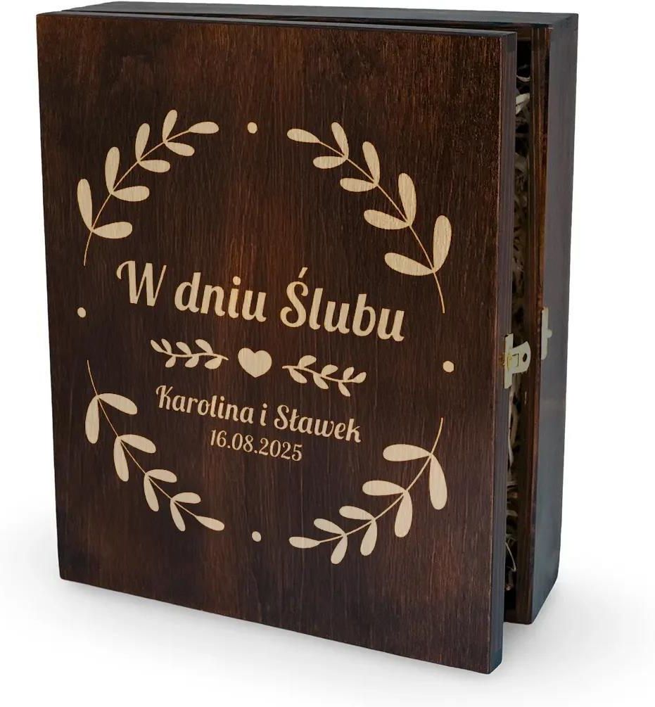W dniu ślubu - imiona + data - grawerowana skrzynka na wino z kieliszkami - produkt personalizowany Kędzierzyn-Koźle