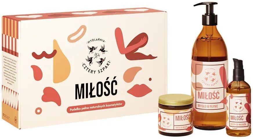 Mydlarnia Cztery Szpaki Zestaw Prezentowy Miłość Trio Zmysłowy rytuał pielęgnacyjny, który pobudza wszystkie zmysły! Mydlarnia Cztery Szpaki Zestaw Prezentowy Miłość Trio to romantyczny komplet kosmetyków z afrodyzjakami - idealny zarówno na prezent, jak i na intymny wieczór we dwoje. W zestawie znajdziesz trzy produkty o uwodzicielskim aromacie grejpfruta, ylang-ylang i paczuli: naturalne mydło w płynie Miłość - gęste, żelowe i wyjątkowo wydajne, które delikatnie oczyszcza i nawilża skórę; olejek do masażu Miłość - cytrusowo-orientalny eliksir z olejem z awokado, który odżywia, regeneruje i koi; oraz świecę do masażu Miłość - po zapaleniu zamienia się w ciepły olejek o właściwościach relaksujących i pielęgnacyjnych. Zestaw Miłość Trio to nie tylko kosmetyki, ale także pełen emocji rytuał, który łączy pielęgnację z przyjemnością i bliskością. Stworzony z naturalnych składników, wegański i bez kompromisów - idealny dla dwojga lub jako prezent dla kogoś wyjątkowego. Korzyści ze stosowania - Kompletny zestaw do masażu i pielęgnacji ciała - Afrodyzyjny zapach grejpfruta, ylang-ylang i paczuli - Naturalne, wegańskie formuły bez sztucznych dodatków - Skóra odżywiona, miękka i gładka - Idealny prezent dla ukochanej osoby lub na Walentynki Sposób użycia Mydło w płynie nanieś na wilgotną skórę i spłucz wodą. Olejek do masażu rozprowadź na skórze, wykonując delikatny masaż. Świecę zapal na kilka minut, aż wosk się rozpuści, następnie zgaś płomień i wmasuj ciepły olejek w ciało. Unikaj kontaktu z oczami. Zawartość zestawu: mydło w płynie Miłość 300ml, olejek do masażu Miłość 100ml, świeca do masażu Miłość 120ml