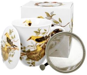 Komplet kubek z pokrywką i zaparzaczem „Ptasi Świat - Wilgi Zwyczajne” z kolekcji Animals Przenieś się w ciepłe objęcia natury i pozwól sobie na chwilę ukojenia z wyjątkowym zestawem „Ptasi Świat – Wilgi Zwyczajne”. Ten niepowtarzalny komplet, inspirowany barwami i wdziękiem wilgi zwyczajnej, przenosi magię lata do Twojej codzienności. Subtelna elegancja, połączona z praktycznym designem, tworzy małe dzieło sztuki, które zachwyca w każdym szczególe. Porcelanowy blask naturalnej doskonałości Kubek i pokrywka zostały wykonane z porcelany New Bone, której delikatna kremowo-biała barwa przypomina letni poranek, skąpany w pierwszych promieniach słońca. Subtelny połysk porcelany podkreśla jej wyrafinowaną lekkość, a zarazem zapewnia wyjątkową trwałość, by cieszyć się pięknem przez długie lata. Wilgi – poezja barw zamknięta w porcelanie Motyw wilgi zwyczajnej zdobi ten zestaw z niezwykłą gracją. Żółto-czarne pióra, niczym słońce otulone cieniem, zdają się migotać na tle subtelnych liści i gniazda pełnego harmonii. Scena ta oddaje kwintesencję letnich chwil – radosnych, beztroskich i przepełnionych urokiem natury. Wzór na porcelanie to nie tylko ozdoba, ale opowieść o świecie pełnym piękna, w którym każdy detal został stworzony z miłością. Zestaw, który rozpieszcza zmysły Kubek o pojemności 430 ml (pojemność liczona po rant kubka): pojemny, wygodny i idealny, by delektować się ulubionym napojem – czy to aromatyczną herbatą, czy wyciszającym naparem z ziół. Porcelanowa pokrywka: utrzymuje ciepło napoju, a przy tym dopełnia wizualną harmonię zestawu. Zaparzacz ze stali nierdzewnej: solidny, funkcjonalny i łatwy w użyciu, pozwala wydobyć głębię smaku z każdej herbaty czy mieszanki. Wyjątkowe cechy zestawu Materiały: porcelana New Bone – delikatna, a jednocześnie odporna, symbol klasy i niezawodności. stal nierdzewna – trwała i łatwa do utrzymania w czystości. Praktyczność: możliwość używania w kuchence mikrofalowej i mycia w zmywarce, co czyni zestaw wygodnym w codziennym użytkowaniu. Eleganckie opakowanie: zapakowany w ozdobne pudełko, które czyni go idealnym prezentem na każdą okazję. Idealny wybór dla miłośników natury, którzy cenią subtelne nawiązania do świata przyrody w codziennych przedmiotach osób szukających praktycznego, a zarazem estetycznego dodatku do swoich rytuałów herbacianych tych, którzy chcą obdarować swoich bliskich czymś wyjątkowym i jednocześnie pełnym ciepła. To coś więcej niż tylko zestaw do parzenia herbaty – to zaproszenie do świata harmonii i spokoju, gdzie każda chwila smaku staje się rytuałem bliskości z naturą. Motyw wilg zwyczajnych, pełen ciepłych barw i finezji, wprowadza do wnętrza odrobinę słonecznego lata i radości. Pozwól, by „Ptasi Świat – Wilgi Zwyczajne” stał się częścią Twojego dnia, dodając mu odrobinę naturalnej elegancji i magii. Wzór: Ptasi świat Wilgi Zwyczajne Produkt 1 x kubek 1 x pokrywka 1 x zaparzacz 1 x ozdobne pudełko Wymiary Średnica: 9,2 cm Wysokość bez pokrywki: 10,5 cm Pojemność całkowita: 430 ml Pojemność użytkowa: około 400 ml Wymiary pudełka: 12,2 cm x 10 cm x h12,5cm Materiał porcelana stal nierdzewna Użytkowanie dopuszczone do kontaktu z żywnością zmywarka mikrofala