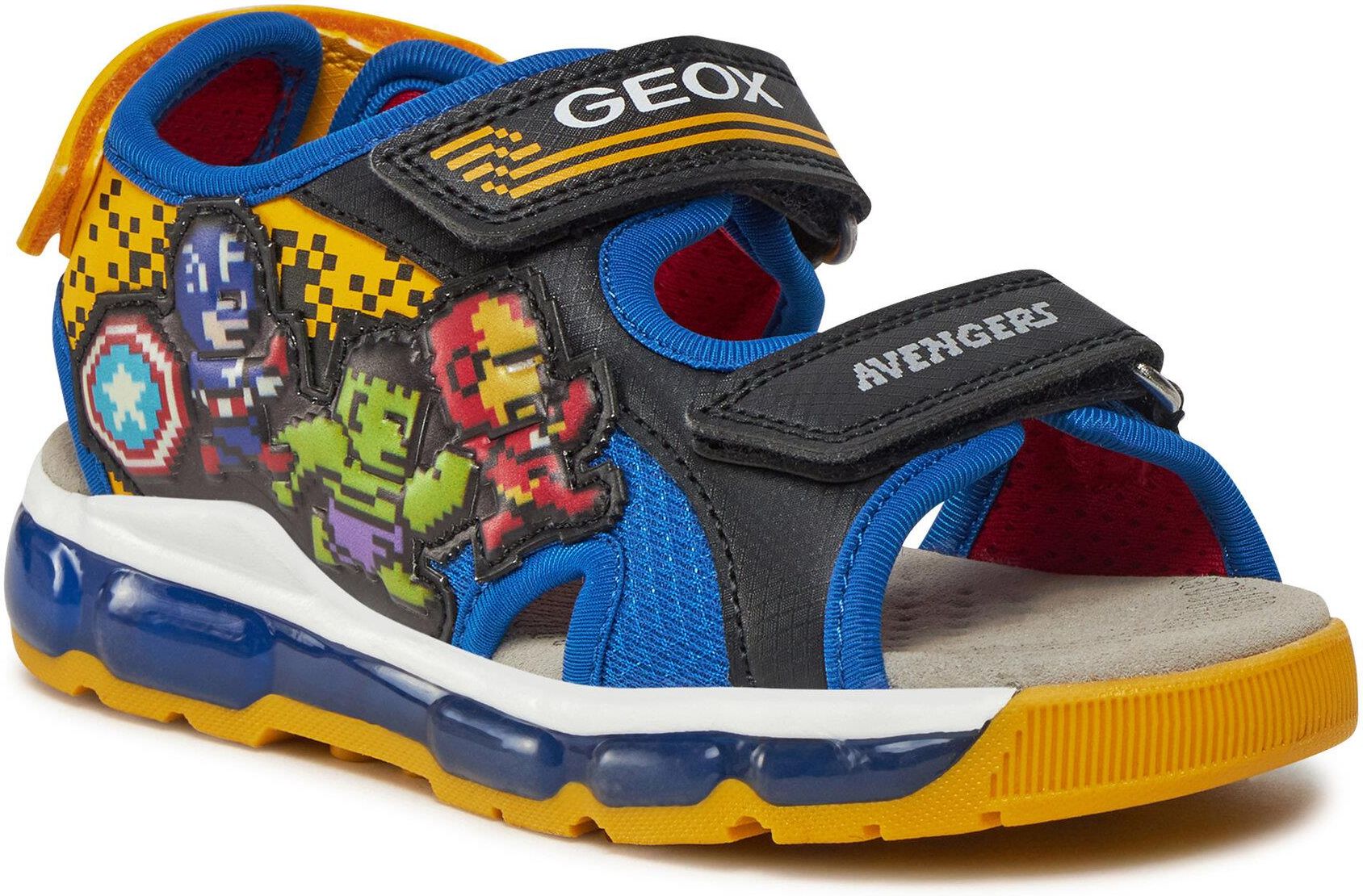 Materiał: 85% Poliuretan, 15% Siateczka poliestrowa Podszewka: 100% Siateczka poliestrowa Podeszwa zewnętrzna: 100% Guma termoplastyczna Wkładka: 100% Skóra bydlęca zamszowa Geox Respira® - perforowana podeszwa z membraną Geox Respira zapewniająca wodoodporność i naturalną termoregulację w codziennym użytkowaniu. Zapięcie na rzep Świecąca podeszwa z przyciskiem ON/OFF Motyw z Marvela® Brand Geox na paskach