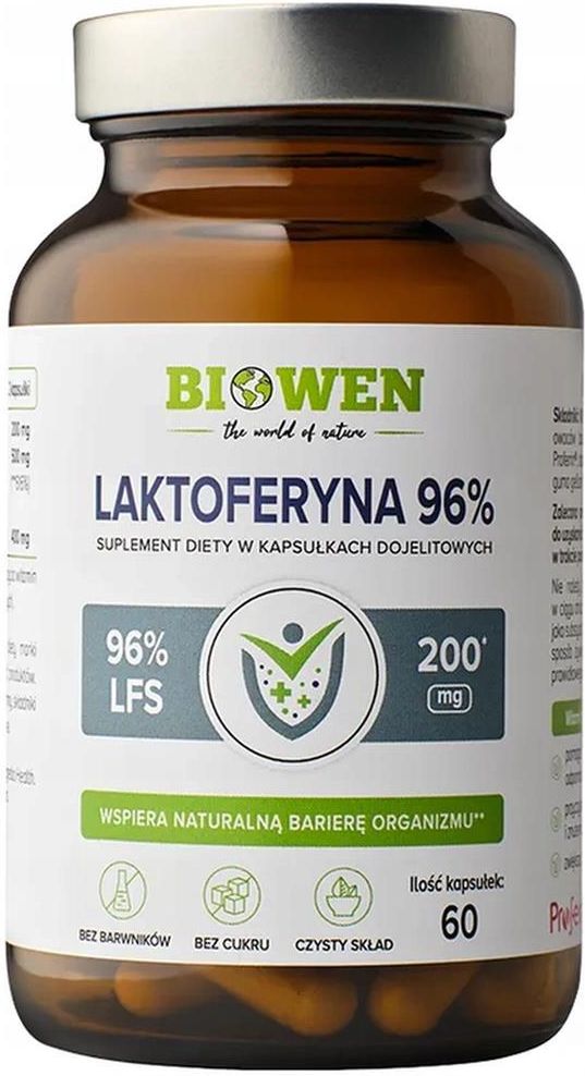 Laktoferyna 96% 60 kaps. 5902906189016 Laktoferyna 96% Biowen 60 kaps Laktoferyna to białko pochodzenia mlecznego, które naturalnie wspiera funkcjonowanie układ odpornościowego i jelit; tylko 3 składniki – laktoferyna Proferrin96%, błonnik z akacji i baobabu Inavea™ i witamina C; suplement sprawdzi się u osób, które chcą zadbać o lepsze przyswajanie żelaza z pożywienia lub nie tolerują tradycyjnych preparatów żelaza; spożywanie laktoferyny wiąże się z rzadszym występowaniem efektów ubocznych ze strony przewodu pokarmowego niż w przypadku tradycyjnych preparatów żelaza; delikatny dla układu pokarmowego - dzięki zawartości błonnika Inavea™ preparat korzystnie wpływa na mikrobiotę jelitową; zastosowanie technologii opóźnionego uwalniania (ang. Delayed Release) sprawia, że kapsułka rozpuszcza się dopiero w jelitach, odciążając żołądek i chroniąc składniki aktywne przed działaniem kwasu żołądkowego; opakowanie zawiera 30 kapsułek. Aby jak najlepiej służyły Twojemu zdrowiu, zamknęliśmy je w szklanym słoiku (BPA FREE) zwieńczonym metalową nakrętką. Masa netto: 40,4 g Laktoferyna - co to? Laktoferyna 96% od Biowen to suplement w kapsułkach łączący w sobie trzy substancje: laktoferynę, czyli naturalne białko mleka wyizolowane ze świeżej serwatki, błonnik z akacji i baobabu oraz witaminę C. Choć sama w sobie nie zawiera żelaza, laktoferyna posiada wyjątkową zdolność do wiązania jonów tego minerału i dostarczania go do odpowiednich komórek w ciele. Dzięki temu szybko stała się wartościowym wsparciem dla osób borykających się z niskim poziomem ferrytyny i anemią, która jest częstą przypadłością m.in. u kobiet w ciąży. Działanie laktoferyny docenią także osoby szukające naturalnego sposobu na wzmocnienie odporności, zmagające się z chorobami autoimmunologicznymi i wrażliwym żołądkiem. Istnieją badania potwierdzające, że substancja ta jest bardziej skuteczna i lepiej tolerowana niż siarczan żelaza w leczeniu niedoboru żelaza i anemii u kobiet, a co więcej - w przypadku suplementacji laktoferyną pacjentki rzadziej rezygnowały z terapii z powodu działań niepożądanych[1]. Jeśli zaburzenia mikrobioty jelitowej nie są Ci obce lub zmagasz się z przewlekłym stanem zapalnym, ten preparat może okazać się cennym wsparciem w drodze do odzyskania dobrego samopoczucia i wewnętrznego balansu. Dlaczego warto wybrać laktoferynę od Biowen? Wiesz już, czym jest laktoferyna, na co może pomóc i komu jest polecana. Sprawdź, czym wyróżnia się laktoferyna od Biowen spośród dziesiątek innych produktów dostępnych na rynku! Czysty i krótki skład, opatentowane formuły oraz klinicznie potwierdzona jakość; tylko 3 wysokiej jakości składniki aktywne: laktoferyna Proferrin®, błonnik Inavea™ i witamina C - bez zbędnej i szkodliwej chemii; preparat jest skuteczny, a przy tym łagodny! Polecany nawet osobom z problemami trawiennymi, zaburzeniami mikrobioty jelitowej czy przewlekłymi stanami zapalnymi; dobrze przemyślany skład oparty o uzupełniające się składniki: witamina C wspiera odporność, zwiększa aktywność laktoferyny i przyswajanie żelaza, a błonnik z baobabu i akacji dba o równowagę mikrobioty, która również przekłada się na wyższą odporność organizmu; wartościowa opcja dla osób zmagających się zarówno z anemią, jak i problemami z nadwrażliwością układu pokarmowego - laktoferyna jest lepiej tolerowana przez przewód pokarmowy niż siarczan żelaza; szklane opakowanie z metalową nakrętką jest przyjazne planecie i Twojemu zdrowiu. Laktoferyna - jak długo można stosować? Preparat najczęściej spożywa się przez około 3-6 miesięcy, okres suplementacji należy jednak dostosować do własnych potrzeb. Celem jest wzmocnienie odporności i ustabilizowanie stanu mikrobioty jelitowej. Wskazania do suplementacji laktoferyny Rozszerz swoją dietę o laktoferynę, jeśli: chcesz uzupełnić niedobory żelaza lub zadbać o równowagę gospodarki żelazowej - laktoferyna pomaga utrzymać optymalny poziom żelaza, zapobiegając zarówno niedoborom, jak i potencjalnym skutkom nadmiaru wolnego żelaza; zależy Ci na redukcji stanów zapalnych - wiążąc wolne żelazo, laktoferyna pomaga ograniczyć rozwój patogenów i zmniejszyć produkcję cytokin prozapalnych; Twoim priorytetem jest wzmocnienie odporności - laktoferyna IgG zawiera sporo przeciwciał (Immunoglobulin typu G), które zwiększają odporność organizmu na infekcje; szukasz produktu łagodnego dla żołądka - badania pokazują, że laktoferyna jest lepiej tolerowana przez przewód pokarmowy niż siarczan żelaza, powodując mniej uszkodzeń błony śluzowej żołądka. Z myślą o Twoim komforcie trawiennym przy produkcji kapsułek zastosowano technologię opóźnionego uwalniania (ang. Delayed Release), dzięki której kapsułka rozpuszcza się dopiero w jelitach. Pomocna dla układu pokarmowego jest także zawartość błonnika z baobabu i akacji, który pomaga utrzymać równowagę mikrobiologiczną jelit. Dzięki temu suplement od Biowen jest bezpiecznym wyborem nawet dla osób z bardzo wrażliwym układem pokarmowym. Pamiętaj, że nawet najlepiej dobrana suplementacja nie zastąpi ruchu i zbilansowanej diety! Składniki suplementu Składniki: Witamina C (askorbinian sodu), błonnik z miąższu owoców baobabu i akacji Inavea™️, laktoferyna 96% Proferrin®. otoczka kapsułki: hydroksypropylometyloceluloza, guma gellan. Laktoferyna - dla kogo? Jako dobrze tolerowany składnik naturalnego pochodzenia, laktoferyna sprawdzi się u osób w różnym wieku i o różnych potrzebach. Laktoferyna dla dzieci? Jak najbardziej! Działanie produktu często doceniają także seniorzy, kobiety w ciąży borykające się z zaburzeniami gospodarki żelazowej, sportowcy i osoby po antybiotykoterapii, które chcą wzmocnić naturalną barierę swojego organizmu. W czym może Ci pomóc la