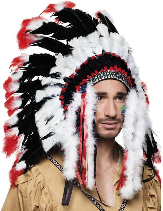 Duży Indiański pióropusz wodza z biało-czarno-czerwonymi piórkami. Opakowanie: 1 szt.