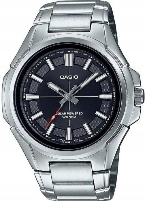 Zegarek Męski Casio MTP-RS100D-1A + BOX OPIS Zegarek męski Casio MTP-RS100D-1A to klasyczna propozycja dla mężczyzn, którzy szukają eleganckiego, ale i funkcjonalnego dodatku do swojej codziennej garderoby. Jego ponadczasowy design i solidne wykonanie sprawiają, że doskonale komponuje się zarówno z casualowymi, jak i bardziej formalnymi stylizacjami. Zegarek ten to kwintesencja prostoty i elegancji, które sprawdzają się w każdej sytuacji. Tarcza zegarka w odcieniu czarnym przyciąga wzrok subtelnym połyskiem, tworząc elegancki kontrast z jasnymi, wyraźnymi indeksami oraz wskazówkami, które zapewniają łatwy i szybki odczyt godziny. Dzięki starannie zaprojektowanej powierzchni, tarcza prezentuje się bardzo schludnie i nowocześnie, a jej minimalizm dodaje zegarkowi szyku. Chroniące ją szkło mineralne jest odporne na zarysowania, dzięki czemu zegarek będzie wyglądał jak nowy przez długi czas. Obudowa zegarka Casio MTP-RS100D-1A została wykonana z wysokiej jakości stali nierdzewnej, co zapewnia nie tylko estetyczny wygląd, ale także trwałość i odporność na codzienne uszkodzenia. Zegarek wyposażony jest w klasyczny stalową bransoletę, która idealnie dopełnia całość. Dzięki precyzyjnie wykonanemu wykończeniu, pasek dobrze układa się na nadgarstku, oferując wygodę i komfort noszenia przez cały dzień. Casio MTP-RS100D-1A to także model, który cechuje się wodoszczelnością do 50 metrów, co sprawia, że zegarek jest odporny na drobne zachlapania, jak deszcz czy mycie rąk. To praktyczna funkcjonalność, która zapewnia wygodę użytkowania w codziennych warunkach, bez obaw o uszkodzenie zegarka. Zegarek Casio MTP-RS100D-1A to idealna propozycja dla mężczyzn, którzy cenią klasyczny styl, wysoką jakość wykonania i niezawodność w jednym. Jego elegancki wygląd oraz solidna konstrukcja sprawiają, że jest to model, który będzie towarzyszył Ci przez długie lata, dodając szyku i charakteru każdej stylizacji. To zegarek, który łączy prostotę z funkcjonalnością, doskonale wpisując się w potrzeby współczesnego mężczyzny. SPECYFIKACJA Mechanizm solarny Koperta i bransoleta ze stali szlachetnej Szkło: mineralne FUNKCJE Wodoszczelność: W50 WYMIARY szerokość koperty: 50 mm grubość koperty: 10 mm szerokość bransolety: 20 mm maksymalny obwód: ok. 20 cm KOLORYSTYKA tarcza: czarna bransoleta: srebrna koperta: srebrna W komplecie pudełko ozdobne Casio